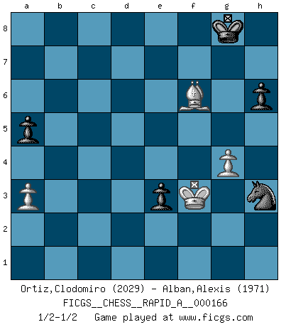 Last move : 1/2-1/2 2014 October 5 6:2:39 [Event "FICGS__CHESS__RAPID_A__000166"] [Site "FICGS"] [Date "2014.09.09"] [Round "1"] [White "Ortiz,Clodomiro"] [Black "Alban,Alexis"] [Result "1/2-1/2"] [WhiteElo "2029"] [BlackElo "1971"] 1.c4 e5 2.Nc3 Nf6 3.g3 Bb4 4.Bg2 O-O 5.Nf3 Nc6 6.Nd5 e4 7.Nh4 d6 8.Nxb4 Nxb4 9.a3 Nc6 10.d3 Re8 11.O-O h6 12.dxe4 Nxe4 13.Qc2 Nc5 14.e3 a5 15.b3 g5 16.Nf3 Qf6 17.Bb2 Bf5 18.Qd2 Qg6 19.b4 Ne4 20.Qe1 Kh7 21.b5 Ne5 22.Nxe5 dxe5 23.g4 Be6 24.Qe2 Rad8 25.Rfd1 Rxd1+ 26.Rxd1 f6 27.h3 Kg7 28.f4 Ng3 29.Qf2 exf4 30.exf4 gxf4 31.Re1 Bxc4 32.Bxf6+ Kg8 33.Rxe8+ Qxe8 34.Kh2 Ne2 35.b6 cxb6 36.Qxb6 Qe3 37.Qxe3 fxe3 38.Bxb7 Nf4 39.Bf3 Bd5 40.Kg3 Bxf3 41.Kxf3 Nxh3 1/2-1/2 English : Bremen, Smyslov system Kingside Castling by player Black (move 4) Kingside Castling by player White (move 11) 10 pieces endgame at move 41 : White KBPPP , Black KNPPP WHITE : King + 1 Bishop 3 Pawns BLACK : King + 1 Knight 3 Pawns 9 pieces endgame at move 41 : White KBPP , Black KNPPP WHITE : King + 1 Bishop 2 Pawns BLACK : King + 1 Knight 3 Pawns This chess game ended in a draw. Follow this game move after move (download)Chess is not like life... it has rules ! (Mark Pasternak) Capablanka war das größte Genie der Schachgeschichte! Aber denken sie nicht er habe nichts vom Schach verstanden. Er wusste nur soviel wie er wissen musste um seine Ziele zu erreichen. (Mikhail Moiseyevich Botvinik) Desconfianza es la característica mas necesaria de un jugador de Ajedrez. (Siegbert Tarrasch) Le système Elo représente seulement une moyenne. Il est simplement un indicateur de votre stabilité. (Anatoli Karpov) The weakness of an artist is dogma. (Josh Waitzkin)