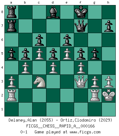 Last move : 0-1 2014 November 11 10:30:46 [Event "FICGS__CHESS__RAPID_A__000166"] [Site "FICGS"] [Date "2014.09.09"] [Round "1"] [White "Delaney,Alan"] [Black "Ortiz,Clodomiro"] [Result "0-1"] [WhiteElo "2055"] [BlackElo "2029"] 1.d4 Nf6 2.c4 e6 3.Nf3 Be7 4.Nc3 d5 5.Bf4 O-O 6.e3 Nbd7 7.c5 Nh5 8.Bd3 b6 9.b4 a5 10.a3 Nxf4 11.exf4 c6 12.O-O Qc7 13.g3 Ba6 14.Re1 Bxd3 15.Qxd3 Ra7 16.Ne5 Nxe5 17.fxe5 b5 18.Ra2 Rfa8 19.R1e2 g6 20.f4 Bd8 21.Qf3 f5 22.Rg2 Qf7 23.h3 g5 24.Kh2 Kf8 0-1 This chess game has been lost on time (started : 2014.09.09 2:15:29) Queen's pawn game Kingside Castling by player Black (move 5) Kingside Castling by player White (move 12) Player Black won this chess game. Follow this game move after move (download)The most important feature of the Chess position is the activity of the pieces. This is absolutely fundamental in all phases of the game: Opening, Middlegame and especially Endgame. The primary constraint on a piece's activity is the Pawn structure. (Michael Stean) Wie kann ich Remis annehmen? Ich weiß ja gar nicht, wie ich stehe! (Fritz Sämisch) Sin errores no puede haber brillantez. (Emanuel Lasker) Le temps de noter son nom sur la feuille de partie, j'étais déjà en zeitnot ! D'un modeste amateur apparié lors de la première ronde d'un open contre le grand-maître Azmaïparashvili. Man is still the most extraordinary computer of all. (John F. Kennedy)