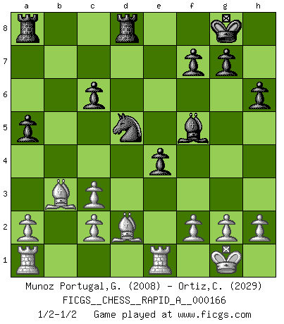 Last move : 1/2-1/2 2014 September 22 6:18:46 [Event "FICGS__CHESS__RAPID_A__000166"] [Site "FICGS"] [Date "2014.09.09"] [Round "1"] [White "Munoz Portugal,Guillermo"] [Black "Ortiz,Clodomiro"] [Result "1/2-1/2"] [WhiteElo "2008"] [BlackElo "2029"] 1.e4 e5 2.Nf3 Nc6 3.Bc4 Nf6 4.Ng5 d5 5.exd5 Na5 6.Bb5 c6 7.dxc6 bxc6 8.Be2 h6 9.Nf3 e4 10.Ne5 Bc5 11.O-O Qd6 12.d4 Qxd4 13.Qxd4 Bxd4 14.Nc4 Nxc4 15.Bxc4 O-O 16.Nc3 Bxc3 17.bxc3 Nd5 18.Re1 Bf5 19.Bd2 Rfd8 20.Bb3 a5 1/2-1/2 Two knights defense Kingside Castling by player White (move 11) Kingside Castling by player Black (move 15) This chess game ended in a draw. Follow this game move after move (download)All my games are real. (Bobby Fischer) Ich liebe den Moment, wenn ich das Ego meines Gegenüber breche. (Robert James Fischer) La última cosa en que Fischer estaba interesado era en tonterías, siempre y cuando el Ajedrez estuviera involucrado. (Elie Agur) Les échecs, c'est l'art d'analyser. (Mikhail Botvinnik) Work expands to fill the time available. (C. Northcote Parkinson, in Parkinson's Laws)