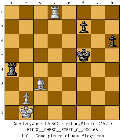 Last move : 1-0 2015 January 22 19:4:8 [Event "FICGS__CHESS__RAPID_A__000166"] [Site "FICGS"] [Date "2014.09.09"] [Round "1"] [White "Carrizo,Jose"] [Black "Alban,Alexis"] [Result "1-0"] [WhiteElo "2050"] [BlackElo "1971"] 1.e4 c6 2.d4 d5 3.Nc3 dxe4 4.Nxe4 Bf5 5.Ng3 Bg6 6.h4 h6 7.Nf3 Nd7 8.h5 Bh7 9.Bd3 Bxd3 10.Qxd3 Qc7 11.Bd2 Ngf6 12.O-O-O e6 13.Ne4 Be7 14.Kb1 Rd8 15.Nxf6+ Nxf6 16.Qe2 c5 17.dxc5 Qxc5 18.Ne5 O-O 19.f4 Bd6 20.a3 a5 21.Rh3 Nd5 22.g4 Qc7 23.Re1 Rc8 24.Rc1 b6 25.c4 Ne7 26.g5 Bxe5 27.fxe5 Nf5 28.gxh6 gxh6 29.Rb3 Qc6 30.Be1 Rb8 31.Bf2 Kh7 32.Qf3 Qxf3 33.Rxf3 b5 34.Be1 Nd4 35.Rd3 Nc6 36.cxb5 Nxe5 37.R3d1 Rxb5 38.a4 Rb7 39.Bxa5 Rfb8 40.Rc2 Ra8 41.Rc7 Rxc7 42.Bxc7 Nc6 43.Rd6 Ne7 44.Rd8 Rxa4 45.Be5 Ng6 46.Bd4 e5 47.hxg6+ Kxg6 48.Bxe5 Kf5 49.Bc3 1-0 Caro-Kann : Classical, 7...Nd7 Queenside Castling by player White (move 12) Kingside Castling by player Black (move 18) 10 pieces endgame at move 47 : White KRBPP , Black KRPPP WHITE : King + 1 Rook 1 Bishop 2 Pawns BLACK : King + 1 Rook 3 Pawns 9 pieces endgame at move 47 : White KRBP , Black KRPPP WHITE : King + 1 Rook 1 Bishop 1 Pawn BLACK : King + 1 Rook 3 Pawns 8 pieces endgame at move 48 : White KRBP , Black KRPP WHITE : King + 1 Rook 1 Bishop 1 Pawn BLACK : King + 1 Rook 2 Pawns Player White won this chess game. Follow this game move after move (download)Why must I lose to this idiot ? (Aron Nimzovich) Versuche, dich von der Sklaverei der Eröffnungsvarianten zu befreien. Stattdessen soll man gewisse Typenpositionen erlernen, die man eingehend analysiert. (Aaron Nimzowitsch) El jugador táctico sabe que hacer cuando hay algo que hacer; mientras que el estratega sabe que hacer cuando no hay nada que hacer. (Gerald Abrahams) Si le désir cupide (et stupide) de gagner est une inépuisable source de souffrance, une combinaison brillante sur l'échiquier est une découverte : le coquelicot qui s'épanouit lorsque apparaît la Voie Lactée. (Arrabal) Always be a first-rate version of yourself, instead of a second-rate version of somebody else. (Judy Garland)