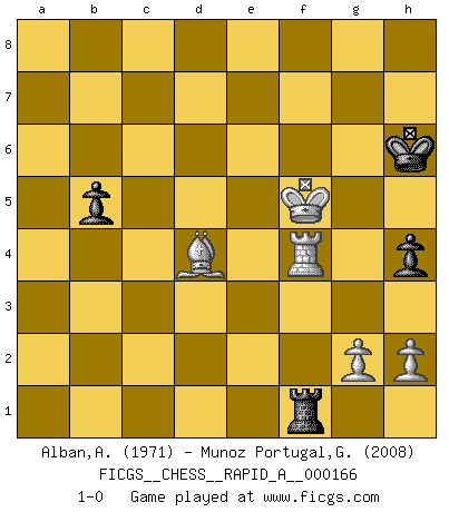 Last move : 1-0 2015 January 1 23:51:21 [Event "FICGS__CHESS__RAPID_A__000166"] [Site "FICGS"] [Date "2014.09.09"] [Round "1"] [White "Alban,Alexis"] [Black "Munoz Portugal,Guillermo"] [Result "1-0"] [WhiteElo "1971"] [BlackElo "2008"] 1.d4 Nf6 2.c4 c6 3.Nf3 d5 4.Nc3 dxc4 5.a4 Bf5 6.Nh4 Bd7 7.Nf3 Bf5 8.Ne5 e6 9.f3 Bb4 10.Nxc4 O-O 11.Kf2 c5 12.e4 Bg6 13.Na2 Nc6 14.Nxb4 Nxb4 15.Qb3 Nxe4 16.fxe4 Bxe4 17.Bf4 Qxd4 18.Qe3 Rfd8 19.Qxd4 cxd4 20.Nd6 Bc6 21.Bc4 Rd7 22.Rad1 Bd5 23.Bxd5 Nxd5 24.Bg3 f5 25.Nc4 f4 26.Bh4 Ne3 27.Nxe3 fxe3 28.Ke2 e5 29.Bg3 Re7 30.Rc1 Kf7 31.Rhf1+ Kg6 32.Kd3 Rh8 33.Ke4 Rd7 34.Rfe1 Re8 35.Rc5 Re6 36.Rxe5 Red6 37.a5 h6 38.Kd3 Rd5 39.b4 h5 40.Rxd5 Rxd5 41.Bb8 b6 42.a6 Rd7 43.Be5 b5 44.Bxd4 Rd6 45.Rxe3 Rxa6 46.Re7 Ra4 47.Ke4 Rxb4 48.Rxa7 h4 49.Rxg7+ Kh6 50.Rg4 Rb1 51.Kf5 Rf1 52.Rf4 1-0 Queen's pawn game Kingside Castling by player Black (move 10) 10 pieces endgame at move 48 : White KRBPP , Black KRPPP WHITE : King + 1 Rook 1 Bishop 2 Pawns BLACK : King + 1 Rook 3 Pawns 9 pieces endgame at move 49 : White KRBPP , Black KRPP WHITE : King + 1 Rook 1 Bishop 2 Pawns BLACK : King + 1 Rook 2 Pawns Player White won this chess game. Follow this game move after move (download)Chess is so inspiring that I do not believe a good player is capable of having an evil thought during the game. (Wilhelm Steinitz) Der zweitbeste Zug ist oft der einzig richtige. (Savielly Grigorievitsch Tartakower) Yo no creo en la psicología. Yo creo en las buenas movidas. (Bobby Fischer) La victoire dans une partie d'Echecs appartient la plupart du temps à celui qui voit un peu plus loin que l'adversaire. (Lasker) Luck is when opportunity knocks and you answer. (Anonymous)