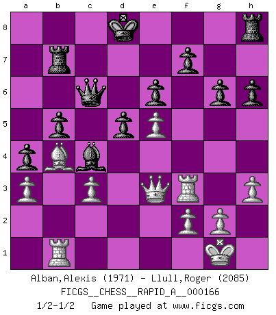 Last move : 1/2-1/2 2014 October 26 2:42:19 [Event "FICGS__CHESS__RAPID_A__000166"] [Site "FICGS"] [Date "2014.09.09"] [Round "1"] [White "Alban,Alexis"] [Black "Llull,Roger"] [Result "1/2-1/2"] [WhiteElo "1971"] [BlackElo "2085"] 1.d4 e6 2.e4 d5 3.Nd2 c5 4.Ngf3 Nf6 5.e5 Nfd7 6.c3 Nc6 7.Bd3 a5 8.Nb1 Qb6 9.O-O cxd4 10.cxd4 Nxd4 11.Nxd4 Qxd4 12.Nc3 Bb4 13.Re1 Qh4 14.a3 Bxc3 15.bxc3 b6 16.Rb1 Nc5 17.Bc2 Ba6 18.Re3 Rb8 19.Rg3 g6 20.h3 h6 21.Be3 Qe7 22.Ba4+ Nxa4 23.Qxa4+ Qd7 24.Qf4 Qc7 25.Bd4 Bc4 26.Qe3 b5 27.Ba7 Rb7 28.Bc5 Qc6 29.Rf3 a4 30.Bb4 Kd8 1/2-1/2 Queen's pawn Kingside Castling by player White (move 9) This chess game ended in a draw. Follow this game move after move (download)Chess is the art which expresses the science of logic. (Mikhail Botvinnik) Ich glaube nicht an Psychologie, ich glaube an gute Züge. (Robert James Fischer) A través de las casillas del tablero, los Indios explican el movimiento del tiempo y la edad, las influencias mas altas que controlan el mundo y los lazos que vinculan al Ajedrez con el alma humana. (Al-Masudi) L'action d'une oeuvre littéraire se déroule sur un champ de bataille. Les masques et les types du drame moderne correspondent aux pièces du jeu d'échecs. L'intrigue correspond aux coups et aux gambits, c'est à dire aux techniques du jeu telles qu'utilisées et interprétées par les joueurs. Les tactiques et les péripéties [mouvements] correspondent aux coups exécutés par l'adversaire. (Viktor Shklovsky) Some people are so afraid to die that they never begin to live. (Henry Van Dyke)