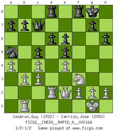 Last move : 1/2-1/2 2014 November 22 1:1:58 [Event "FICGS__CHESS__RAPID_A__000166"] [Site "FICGS"] [Date "2014.09.09"] [Round "1"] [White "Cesbron,Guy"] [Black "Carrizo,Jose"] [Result "1/2-1/2"] [WhiteElo "1932"] [BlackElo "2050"] 1.e4 e5 2.Nf3 Nc6 3.Bc4 Nf6 4.d3 Be7 5.O-O O-O 6.Re1 d6 7.a4 Na5 8.Ba2 c5 9.Nbd2 Be6 10.Bxe6 fxe6 11.Nc4 Nxc4 12.dxc4 Nd7 13.Qe2 Nb8 14.Rd1 Nc6 15.c3 Qe8 16.Bg5 Rd8 17.Bxe7 Qxe7 18.b3 Qc7 19.Rd2 Na5 20.Rb1 h6 1/2-1/2 Two knights defense (Modern Bishop's Opening) Kingside Castling by player White (move 5) Kingside Castling by player Black (move 5) This chess game ended in a draw. Follow this game move after move (download)The Chess pieces are the block alphabet which shapes thoughts; and these thoughts, although making a visual design on the chessboard, express their beauty abstractly, like a poem. (Marcel Duchamp) Er war ein guter Schachspieler, aber ich kann Leute nicht ausstehen, die 'Heil Hitler' rufen (Über Alexander Aljechin). (Miguel Najdorf) Sin errores no puede haber brillantez. (Emanuel Lasker) Pour se monter efficace, un Cavalier a besoin d'avant-postes ! Les Cavaliers font les meilleurs bloqueurs de pions passés. It's unlucky to be superstitious. (Dave Enteles)