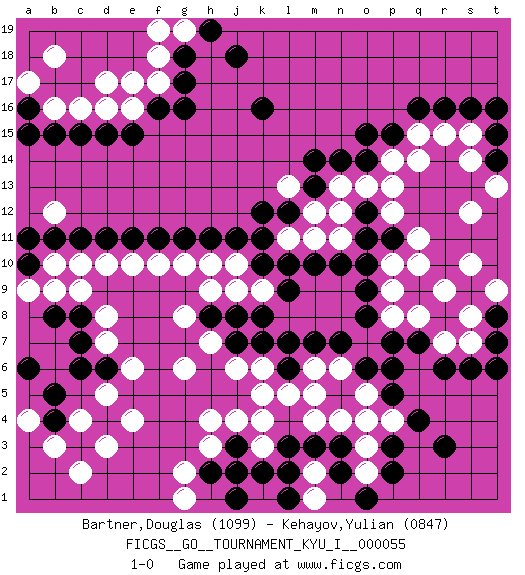 Last move : 1-0 2014 November 3 22:30:53 [Event "FICGS__GO__TOURNAMENT_KYU_I__000055"] [Site "FICGS"] [Date "2014.09.12"] [Round "1"] [Black "Bartner,Douglas"] [White "Kehayov,Yulian"] [Result "1-0"] [Rating 1 "1099"] [Rating 2 "0847"] 1.q16 c4 2.q4 d17 3.d15 q10 4.f16 f17 5.g17 e17 6.g16 c16 7.c15 b16 8.b15 o3 9.p3 o4 10.r6 r7 11.c11 r15 12.r16 q15 13.p15 p14 14.o15 h4 15.o14 p13 16.k16 c10 17.d11 d10 18.e11 e10 19.h11 k9 20.k11 h9 21.c3 d3 22.d4 d5 23.b4 e4 24.b5 b3 25.c7 d7 26.c8 d8 27.c6 c2 28.d6 e6 29.b8 b9 30.a6 a4 31.p6 o7 32.o6 n6 33.n5 o5 34.n7 m6 35.m7 m5 36.l7 k6 37.m10 m11 38.l10 l11 39.k10 j10 40.k12 l13 41.l12 m12 42.m13 n13 43.m14 o13 44.o11 n11 45.n10 n12 46.p11 q11 47.l6 l5 48.k7 j6 49.j7 h7 50.p2 g10 51.n2 m2 52.n3 n4 53.m3 o2 54.o1 m1 55.l3 k3 56.k2 j2 57.j3 k4 58.h2 h3 59.j1 g2 60.l2 j4 61.j2 g1 62.a16 a17 63.a15 b18 64.s16 s15 65.t15 s14 66.t14 t13 67.t16 s12 68.p7 q8 69.o9 p9 70.o8 p8 71.s6 s7 72.t7 s8 73.t8 t9 74.t6 s10 75.g11 f10 76.f11 b12 77.b11 b10 78.a11 c9 79.j8 j9 80.h8 g8 81.n14 h10 82.j11 g6 83.g18 f18 84.l9 p4 85.r3 m4 86.l1 k5 87.p5 g19 88.h19 f19 89.j18 p12 90.a10 a9 91.q7 r9 92.k8 e16 93.e15 d16 94.o10 p10 95.o12 q14 96.pass 1-0 Here are the names of the openings (joseki) played in the four corners : Corner d16 : d17 d15 Komoku (Somok, Xiao~mu`) 3-4 Point. The komoku (3-4) point is the traditional corner enclosure move.. Ikken Takagakari (Hankan Nop'dakeolch'im, Yi Gaogua`jiao~, 1-Space High Approach). The 5-4 approach move has become more popular in modern times, as modern Go emphasizes speed and influence. Corner q4 : q4 o3 Hoshi (Hwajeom, Seongjeom, Xingwei`) 4-4 Point. The star or hoshi (4-4) point, emphasizing influence at the potential expense of territory. Ikken Kakari (Hankan Keolch'im, Yi Gua`jiao~, 1-Space Low Approach). White 2 is the standard approach move to the 4-4. Corner q16 : q16 r15 Hoshi (Hwajeom, Seongjeom, Xingwei`) 4-4 Point. The star or hoshi (4-4) point, emphasizing influence at the potential expense of territory. Player Black won this Go (weiqi, baduk) game. Follow this game move after move (download)Studying go is a wonderful way to develop both the creative as well as the logical abilities of children because to play it both sides of the brain are necessary. (Cho Chikun) Memory is a complicated thing, a relative to truth, but not its twin. (Barbara Kingsolver, Animal Dreams)