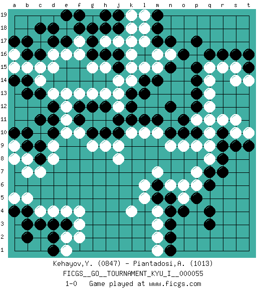Last move : 1-0 2015 March 18 3:0:47 [Event "FICGS__GO__TOURNAMENT_KYU_I__000055"] [Site "FICGS"] [Date "2014.09.12"] [Round "1"] [Black "Kehayov,Yulian"] [White "Piantadosi,Angelo"] [Result "1-0"] [Rating 1 "0847"] [Rating 2 "1013"] 1.r16 d4 2.q3 d16 3.p15 q10 4.d10 c7 5.c13 e13 6.c8 d8 7.c9 d9 8.n4 k4 9.o10 p9 10.p12 o9 11.n17 k16 12.c16 c15 13.b16 b15 14.d17 e16 15.e17 f17 16.c18 m3 17.n3 m4 18.n5 m7 19.n10 l10 20.j10 j8 21.l11 m10 22.m11 k10 23.k11 n9 24.p10 p11 25.o11 q11 26.n12 j9 27.h10 g9 28.g10 f10 29.f11 e10 30.d11 e11 31.f12 f13 32.g12 h13 33.h12 j12 34.j11 j13 35.l14 l15 36.m14 k14 37.l13 m15 38.n15 n16 39.o16 m16 40.m17 l17 41.m18 l18 42.m19 l19 43.b13 e12 44.d12 d13 45.b14 a15 46.a14 a16 47.b17 e18 48.d18 c14 49.f18 g18 50.e19 q12 51.p13 q13 52.e3 e4 53.d3 f3 54.c3 c4 55.b4 b5 56.a4 a5 57.b2 e2 58.d2 f2 59.d1 p6 60.q6 o6 61.q7 p7 62.r8 q8 63.r9 q14 64.p14 q15 65.q16 r15 66.s16 s15 67.t15 t14 68.t16 s14 69.p5 o5 70.o4 n6 71.n2 m2 72.n1 m1 73.m5 l5 74.m6 l6 75.r10 r11 76.a17 b8 77.b9 b7 78.b10 a9 79.a10 a8 80.c11 e1 81.b3 g19 82.f19 h9 83.p17 q9 84.q4 s10 85.s9 t10 86.t9 s11 87.g17 h17 88.g16 f16 89.h18 g15 90.h16 j17 91.j18 k18 92.j16 k17 93.j15 j14 94.h19 k15 95.g18 h15 96.k12 g13 97.k13 d15 98.j19 k19 99.r7 f4 100.pass 1-0 Here are the names of the openings (joseki) played in the four corners : Corner d16 : d16 c13 Hoshi (Hwajeom, Seongjeom, Xingwei`) 4-4 Point. The star or hoshi (4-4) point, emphasizing influence at the potential expense of territory. Niken Kakari (Dukan Keolch'im, E`r Gua`jiao~, 2-Space Low Approach). White typically answers by 7-3 or 3-5 (which is not joseki). Player Black won this Go (weiqi, baduk) game. Follow this game move after move (download)Keshi is worth as much as an invasion ! (Anonymous) The modern world has divided itself into Conservatives and Progressives. The business of Progressives is to go on making mistakes. The business of the Conservatives is to prevent the mistakes from being corrected. (G.K. Chesterton)