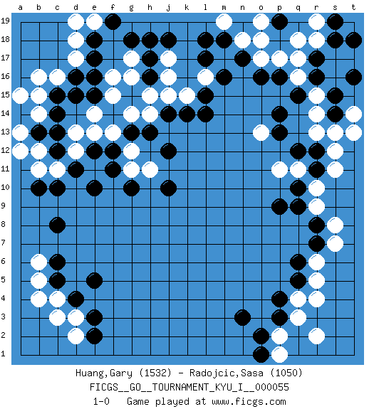 Last move : 1-0 2014 December 3 7:17:8 [Event "FICGS__GO__TOURNAMENT_KYU_I__000055"] [Site "FICGS"] [Date "2014.09.12"] [Round "1"] [Black "Huang,Gary"] [White "Radojcic,Sasa"] [Result "1-0"] [Rating 1 "1532"] [Rating 2 "1050"] 1.q15 q3 2.q5 r4 3.p3 q4 4.p4 r5 5.q6 p2 6.o2 p1 7.n3 d3 8.d4 c4 9.c5 b4 10.e3 d2 11.e5 b5 12.c6 c16 13.d16 d17 14.e17 d18 15.c15 b16 16.e16 b15 17.c14 b14 18.c12 b6 19.c8 q17 20.o16 o17 21.n17 o18 22.m16 r6 23.r17 r18 24.s18 r19 25.r16 n18 26.m18 m19 27.l18 q16 28.p16 p17 29.n19 o19 30.r7 r15 31.s15 r14 32.s14 r13 33.p14 s13 34.s19 q18 35.p19 t14 36.t16 t13 37.t18 o13 38.p13 q11 39.q12 s11 40.r11 r10 41.r12 s12 42.q10 r9 43.q9 s7 44.r8 s8 45.o1 r2 46.e2 c3 47.e18 e19 48.f19 d19 49.g18 p11 50.p9 f15 51.g13 g14 52.h13 f13 53.f12 e13 54.e12 d13 55.c13 h14 56.j14 j15 57.h16 h15 58.k14 j16 59.h17 l16 60.l15 k15 61.l14 f16 62.e15 g16 63.l17 j17 64.j18 d12 65.d11 g12 66.f11 g11 67.g10 h11 68.j12 c11 69.c10 b11 70.e10 b12 71.b13 a13 72.b10 a12 73.a14 a15 74.j10 g17 75.h18 e14 76.d15 1-0 Here are the names of the openings (joseki) played in the four corners : Corner q4 : q3 q5 Komoku (Somok, Xiao~mu`) 3-4 Point. The komoku (3-4) point is the traditional corner enclosure move.. Ikken Takagakari (Hankan Nop'dakeolch'im, Yi Gaogua`jiao~, 1-Space High Approach). The 5-4 approach move has become more popular in modern times, as modern Go emphasizes speed and influence. Corner d4 : d3 d4 Komoku (Somok, Xiao~mu`) 3-4 Point. The komoku (3-4) point is the traditional corner enclosure move.. Corner d16 : c16 d16 Komoku (Somok, Xiao~mu`) 3-4 Point. The komoku (3-4) point is the traditional corner enclosure move.. Corner q16 : q15 q17 Takamoku (Gomok, Gaomu`) 5-4 Point. The takamoku (high) point (5-4). With its emphasis on influence, the 5-4 point complements the 4-4 (hoshi) point in creating an influence-oriented fuseki. Komoku. Black responds with 3-3, 3-5, 4-6, 4-7, 3-6, 3-7. Player Black won this Go (weiqi, baduk) game. Follow this game move after move (download)Go is to western chess what philosophy is to double entry accounting. (from Shibumi, by Trevanian) There are three kinds of lies: lies, damned lies and statistics. (Mark Twain)