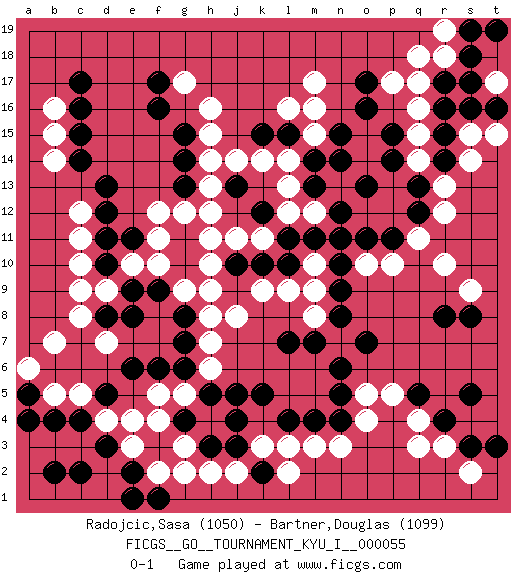 Last move : 0-1 2014 October 26 16:37:45 [Event "FICGS__GO__TOURNAMENT_KYU_I__000055"] [Site "FICGS"] [Date "2014.09.12"] [Round "1"] [Black "Radojcic,Sasa"] [White "Bartner,Douglas"] [Result "0-1"] [Rating 1 "1050"] [Rating 2 "1099"] 1.c16 q16 2.c4 q3 3.q5 o4 4.r4 r3 5.s3 l3 6.j4 r10 7.r8 r13 8.f16 e4 9.d3 e3 10.e2 f2 11.e1 d4 12.c2 c5 13.b4 b5 14.a5 g5 15.k5 h7 16.l7 n7 17.n5 o5 18.n4 n3 19.m4 m3 20.l4 d9 21.d11 e10 22.e11 a6 23.a4 b7 24.b2 h16 25.g15 g17 26.f17 m17 27.o17 p17 28.o16 m15 29.p15 q15 30.p14 n13 31.q13 r12 32.q12 q11 33.p11 p10 34.o11 o10 35.n11 m12 36.m11 h15 37.g14 m9 38.n6 l12 39.l10 l9 40.k10 k9 41.n8 j11 42.j10 h11 43.n9 m10 44.n10 j8 45.l11 q14 46.o13 g9 47.g7 h6 48.f9 f10 49.g8 h8 50.f6 m8 51.m7 c10 52.d10 c11 53.g10 h9 54.e9 f11 55.g11 f12 56.d12 c12 57.d13 h10 58.d8 c9 59.g6 f5 60.e6 c8 61.e8 d7 62.k12 h12 63.j13 h14 64.m14 l14 65.n14 l13 66.g13 g12 67.l15 l16 68.k15 k14 69.n12 j14 70.h5 h13 71.d5 g3 72.g4 f4 73.h3 h4 74.j5 h2 75.j3 j2 76.k2 k3 77.f1 l2 78.g4 g2 79.n15 m16 80.m13 s9 81.s8 s2 82.t3 q4 83.s5 p5 84.o7 b14 85.c14 b15 86.c15 b16 87.c17 k11 88.r17 r18 89.r16 q17 90.s18 q18 91.s19 s15 92.s16 t17 93.r15 s14 94.t16 t18 95.r14 t15 96.s17 r19 97.t19 t17 0-1 Here are the names of the openings (joseki) played in the four corners : Corner q4 : q3 q5 Komoku (Somok, Xiao~mu`) 3-4 Point. The komoku (3-4) point is the traditional corner enclosure move.. Ikken Takagakari (Hankan Nop'dakeolch'im, Yi Gaogua`jiao~, 1-Space High Approach). The 5-4 approach move has become more popular in modern times, as modern Go emphasizes speed and influence. Player White won this Go (weiqi, baduk) game. Follow this game move after move (download)One big eye kills one small eye. (Anonymous) As the days dwindle down... to a precious few. (Maxwell Anderson)