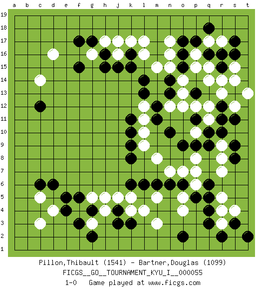 Last move : 1-0 2014 September 29 23:55:11 [Event "FICGS__GO__TOURNAMENT_KYU_I__000055"] [Site "FICGS"] [Date "2014.09.12"] [Round "1"] [Black "Pillon,Thibault"] [White "Bartner,Douglas"] [Result "1-0"] [Rating 1 "1541"] [Rating 2 "1099"] 1.r16 d16 2.q3 d4 3.f17 c14 4.o17 h17 5.f15 l17 6.k16 k17 7.h16 g16 8.g17 j16 9.h15 j17 10.j15 l16 11.k15 m15 12.q9 r14 13.r15 q14 14.o15 n16 15.o16 n17 16.r12 o14 17.n14 o13 18.n13 o12 19.m11 q11 20.r11 q12 21.q10 n12 22.m12 r13 23.p11 p12 24.n10 q15 25.q16 n15 26.l14 s12 27.s11 p15 28.p13 p16 29.p17 q17 30.q18 r17 31.s17 s15 32.s16 s14 33.f3 t13 34.c6 c3 35.e5 c5 36.d6 o4 37.q5 m3 38.k3 m5 39.o2 k4 40.j3 l4 41.o6 h5 42.j4 j5 43.k6 k5 44.l6 f4 45.g4 g5 46.e4 g3 47.f5 h4 48.g2 r4 49.q4 r5 50.s3 r3 51.r2 s4 52.t2 r7 53.s8 r8 54.s9 p7 55.q6 p8 56.o9 o7 57.n6 n7 58.m6 m8 59.k8 r9 60.r10 l9 61.k9 l10 62.k10 l11 63.k11 l12 64.l13 p6 65.p5 p10 66.p9 o5 67.c12 1-0 Here are the names of the openings (joseki) played in the four corners : Corner d16 : d16 f17 Hoshi (Hwajeom, Seongjeom, Xingwei`) 4-4 Point. The star or hoshi (4-4) point, emphasizing influence at the potential expense of territory. Ikken Kakari (Hankan Keolch'im, Yi Gua`jiao~, 1-Space Low Approach). Black 2 is the standard approach move to the 4-4. Corner d4 : d4 f3 Hoshi (Hwajeom, Seongjeom, Xingwei`) 4-4 Point. The star or hoshi (4-4) point, emphasizing influence at the potential expense of territory. Ikken Kakari (Hankan Keolch'im, Yi Gua`jiao~, 1-Space Low Approach). Black 2 is the standard approach move to the 4-4. Player Black won this Go (weiqi, baduk) game. Follow this game move after move (download)Beginner's games are surprising, often incoherent and incomprehensible. When you improve, your game gains in consistency but flirts with stupidity: you become satisfied with truisms and mechanical movements, you try to obtain a feeling for clearness and style the easy way. (Pierre Audouard) Fame, I have already. Now I need the money. (an elderly Steinitz)