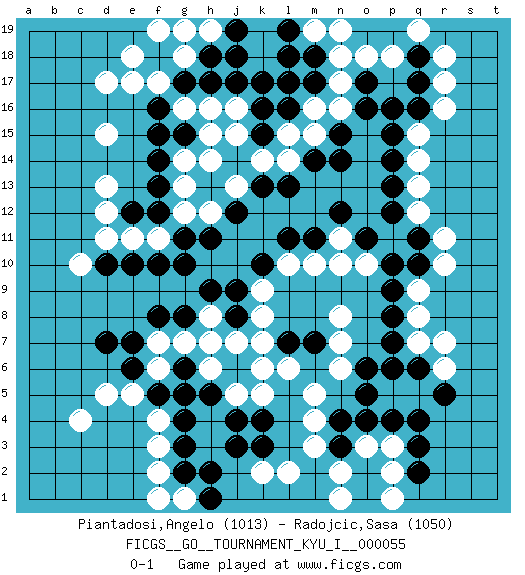 Last move : 0-1 2015 March 8 2:16:15 [Event "FICGS__GO__TOURNAMENT_KYU_I__000055"] [Site "FICGS"] [Date "2014.09.12"] [Round "1"] [Black "Piantadosi,Angelo"] [White "Radojcic,Sasa"] [Result "0-1"] [Rating 1 "1013"] [Rating 2 "1050"] 1.q16 c4 2.q4 d17 3.q10 q12 4.p13 q13 5.p12 q14 6.p14 q15 7.p15 r16 8.p16 r17 9.q17 r18 10.k16 h16 11.h17 g16 12.g17 f17 13.f18 e18 14.f16 e17 15.g15 h15 16.f14 g18 17.h18 f19 18.j17 h14 19.j12 k14 20.l13 l14 21.k13 g14 22.f15 g12 23.f13 g13 24.g10 f11 25.f10 e11 26.e10 d11 27.f12 d13 28.e12 d12 29.g11 d15 30.j14 j15 31.k15 j13 32.m14 l15 33.l16 m15 34.n14 h12 35.h11 m16 36.m17 n17 37.l17 n16 38.n15 n18 39.m18 p18 40.q18 q19 41.o16 n19 42.d7 d5 43.e6 e5 44.f5 f4 45.g5 m19 46.k4 m4 47.n3 m3 48.n4 n2 49.o2 n1 50.o1 l2 51.k3 o3 52.o4 p3 53.q3 p2 54.q2 p1 55.p4 m5 56.m7 q8 57.p8 q7 58.p7 q9 59.p9 r10 60.q11 r11 61.l19 k19 62.l18 k18 63.j18 j16 64.k17 h19 65.j19 g19 66.o17 o18 67.d10 l6 68.l7 k6 69.h7 j7 70.j6 k7 71.j8 k8 72.j9 k9 73.k10 l10 74.l11 m10 75.m11 n11 76.n12 h6 77.g6 j5 78.h5 h8 79.h9 g7 80.j4 k5 81.g4 f3 82.g3 f2 83.g2 g1 84.g8 h7 85.f8 o10 86.o11 n10 87.p10 n7 88.p6 n8 89.q6 r6 90.r5 r7 91.o5 n6 92.o6 f7 93.e7 c10 94.h1 f1 95.h2 k2 96.j3 f6 0-1 Here are the names of the openings (joseki) played in the four corners : Corner q16 : q16 q12 Hoshi (Hwajeom, Seongjeom, Xingwei`) 4-4 Point. The star or hoshi (4-4) point, emphasizing influence at the potential expense of territory. Corner d4 : c4 d7 Komoku (Somok, Xiao~mu`) 3-4 Point. The komoku (3-4) point is the traditional corner enclosure move.. Corner q4 : q4 m4 Hoshi (Hwajeom, Seongjeom, Xingwei`) 4-4 Point. The star or hoshi (4-4) point, emphasizing influence at the potential expense of territory. Player White won this Go (weiqi, baduk) game. Follow this game move after move (download)Learn the eye-stealing tesuji. (Anonymous) The Internet is so big, so powerful and pointless that for some people it is a complete substitute for life. (Andrew Brown)