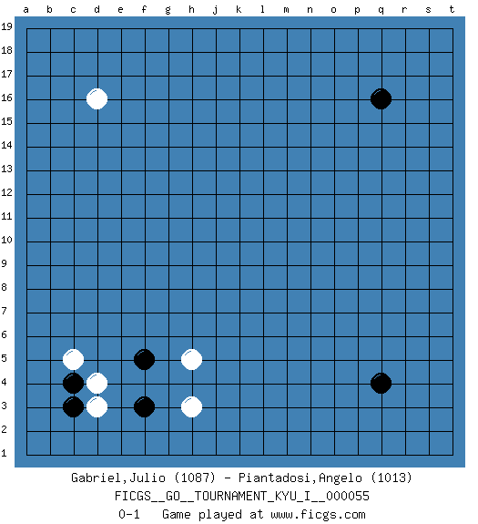 Last move : 0-1 2014 October 27 21:37:10 [Event "FICGS__GO__TOURNAMENT_KYU_I__000055"] [Site "FICGS"] [Date "2014.09.12"] [Round "1"] [Black "Gabriel,Julio"] [White "Piantadosi,Angelo"] [Result "0-1"] [Rating 1 "1087"] [Rating 2 "1013"] 1.q16 d16 2.q4 d4 3.f3 h3 4.c3 d3 5.f5 h5 6.c4 c5 0-1 This go game has been lost on time (started : 2014.09.12 14:20:3) Here are the names of the openings (joseki) played in the four corners : Corner d4 : d4 f3 Hoshi (Hwajeom, Seongjeom, Xingwei`) 4-4 Point. The star or hoshi (4-4) point, emphasizing influence at the potential expense of territory. Ikken Kakari (Hankan Keolch'im, Yi Gua`jiao~, 1-Space Low Approach). Black 2 is the standard approach move to the 4-4. Player White won this Go (weiqi, baduk) game. Follow this game move after move (download)Don't count territory held by only one eye. (Anonymous) The ego is not master in its own house. (Sigmund Freud)
