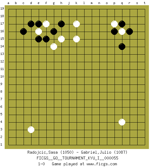 Last move : 1-0 2014 October 27 9:36:7 [Event "FICGS__GO__TOURNAMENT_KYU_I__000055"] [Site "FICGS"] [Date "2014.09.12"] [Round "1"] [Black "Radojcic,Sasa"] [White "Gabriel,Julio"] [Result "1-0"] [Rating 1 "1050"] [Rating 2 "1087"] 1.c16 q4 2.q17 d3 3.q14 k17 4.h17 e16 5.d17 f17 6.g16 k15 7.e15 g14 8.f15 h15 9.e17 q16 10.r16 p17 11.p16 1-0 This go game has been lost on time (started : 2014.09.12 14:20:3) Here are the names of the openings (joseki) played in the four corners : Player Black won this Go (weiqi, baduk) game. Follow this game move after move (download)The monkey jump is worth eight points. (Anonymous) Excelling at chess has long been considered a symbol of more general intelligence. That is an incorrect assumption in my view, as pleasant as it might be. But for the purposes of argument and investigation, chess is, in Russkin-Gutman's words, 'an unparalleled laboratory, since both the learning process and the degree of ability obtained can be objectified and quantified, providing an excellent comparative framework on which to use rigorous analytical techniques.' (The Chess Master and the Computer, by Garry Kasparov - 2010)
