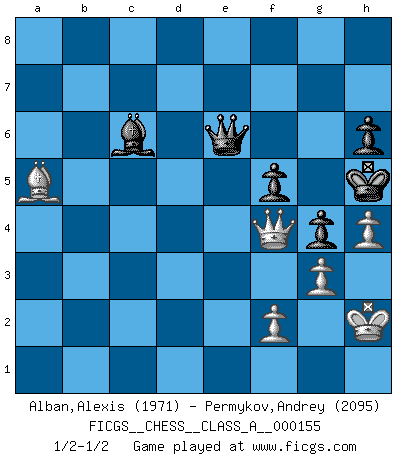 Last move : 1/2-1/2 2015 January 27 19:36:44 [Event "FICGS__CHESS__CLASS_A__000155"] [Site "FICGS"] [Date "2014.09.15"] [Round "1"] [White "Alban,Alexis"] [Black "Permykov,Andrey"] [Result "1/2-1/2"] [WhiteElo "1971"] [BlackElo "2095"] 1.d4 Nf6 2.c4 e6 3.Nf3 b6 4.g3 Bb7 5.Bg2 c5 6.d5 exd5 7.cxd5 Bxd5 8.Nc3 Bc6 9.e4 Nxe4 10.Nxe4 Bxe4 11.Qe2 Qe7 12.O-O Nc6 13.Bf4 Bf5 14.Qb5 Rc8 15.Rfe1 Be6 16.Rad1 h6 17.Qa6 Qd8 18.Ne5 Nd4 19.Bb7 Rc7 20.Nf3 Rxb7 21.Qxb7 Nxf3+ 22.Qxf3 Qc8 23.Be5 Rg8 24.Qe4 f5 25.Qe2 Kf7 26.Qh5+ g6 27.Qh4 g5 28.Qh5+ Rg6 29.h4 g4 30.Rd5 Qc6 31.Rd3 Be7 32.Bf4 Kg7 33.Rd2 Bf6 34.Rd6 Qc8 35.b3 Kh7 36.Kh2 Bc3 37.Re2 Bd4 38.a4 Bg7 39.Red2 Bf8 40.R6d5 d6 41.R5d3 Rf6 42.Rxd6 Bxd6 43.Rxd6 Qf8 44.a5 bxa5 45.Rc6 Bxb3 46.Rxf6 Qxf6 47.Qe8 a6 48.Qc8 a4 49.Qxc5 Kg6 50.Bc1 Kh5 51.Qc8 Bd5 52.Qe8+ Qg6 53.Qxa4 Qe6 54.Qf4 a5 55.Bd2 Bc6 56.Bxa5 1/2-1/2 Queen's Indian : 4.g3 Bb7 Kingside Castling by player White (move 12) This chess game ended in a draw. Follow this game move after move (download)Place the contents of the Chess box in a hat, shake them up vigorously, pour them on the board from a height of two feet, and you get the style of Steinitz. (H. E. Bird) Jeder leidlich begabte Spieler, er braucht keineswegs hervorragend veranlagt zu sein, kann es zum Meister bringen. Aber das ist ja auch gar nicht nötig! Der richtige Standpunkt ist es, zu seinem Vergnügen zu spielen, und man glaube ja nicht, dass der Genuss proportional dem Können sei. (Siegbert Tarrasch) Coloca el contenido de las piezas del Ajedrez en un sombrero, agitalo vigorosamente, arrojalas en un tablero desde una altura de 30 centimetros y así obtendras el estilo de Steinitz. (H. E. Bird) Les échecs, c'est l'imagination. (David Bronstein) To err is human, to shift the blame on someone else is tactical. (Mladen Jankovic)