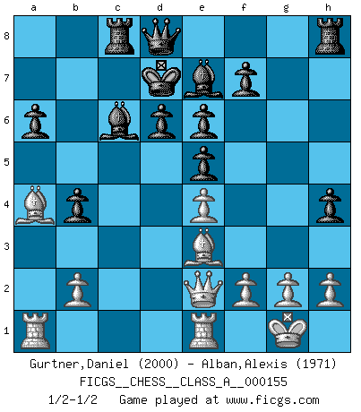 Last move : 1/2-1/2 2015 January 26 15:3:25 [Event "FICGS__CHESS__CLASS_A__000155"] [Site "FICGS"] [Date "2014.09.15"] [Round "1"] [White "Gurtner,Daniel"] [Black "Alban,Alexis"] [Result "1/2-1/2"] [WhiteElo "2000"] [BlackElo "1971"] 1.e4 c5 2.d4 cxd4 3.c3 dxc3 4.Nxc3 e6 5.Nf3 Nc6 6.Bc4 a6 7.O-O b5 8.Bb3 Bb7 9.a4 Nf6 10.Re1 b4 11.Nd5 Rc8 12.Bg5 h6 13.Nxf6+ gxf6 14.Bh4 Be7 15.Qd3 Qb6 16.Rad1 d6 17.Qe2 h5 18.Bg3 Na5 19.Bc2 Nc4 20.Bb3 Ne5 21.Bf4 h4 22.Nxe5 fxe5 23.Be3 Qd8 24.Qg4 Kd7 25.a5 Qxa5 26.Ra1 Qd8 27.Ba4+ Bc6 28.Qe2 1/2-1/2 Sicilian : Smith-Morra gambit Kingside Castling by player White (move 7) This chess game ended in a draw. Follow this game move after move (download)When your house is on fire, you can't be bothered with the neighbors. Or, as we say in Chess, if your King is under attack you don't worry about losing a Pawn on the Queen's side. (Gary Kasparov) Kritik überlasse ich den Spießern. Ich zeige nichts, wofür ich mich schämen muss. (Alexandra Kosteniuk) El Peón aislado arroja penumbra sobre todo el tablero. (Aaron Nimzovich) En blitz, le Cavalier l'emporte sur le Fou. (Vlastimil Hort) 'preceded by its own quotation yields a falsehood' preceded by its own quotation yields a falsehood. (W. V. O. Quine - Set Theory And Its Logic, 1953)