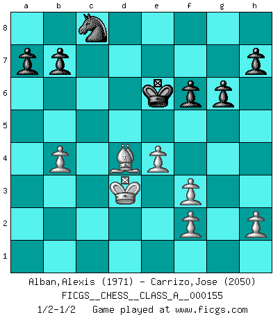 Last move : 1/2-1/2 2015 January 18 16:50:14 [Event "FICGS__CHESS__CLASS_A__000155"] [Site "FICGS"] [Date "2014.09.15"] [Round "1"] [White "Alban,Alexis"] [Black "Carrizo,Jose"] [Result "1/2-1/2"] [WhiteElo "1971"] [BlackElo "2050"] 1.d4 d5 2.c4 e6 3.Nf3 c6 4.Qc2 Nf6 5.Nbd2 c5 6.dxc5 Bxc5 7.cxd5 Qc7 8.e3 Nxd5 9.b3 Be7 10.Bb5+ Bd7 11.Qxc7 Nxc7 12.Be2 Nc6 13.Bb2 f6 14.O-O e5 15.a3 Be6 16.Rac1 Kf7 17.b4 Rac8 18.Ne4 Rhd8 19.Nc5 Bxc5 20.Rxc5 Na8 21.Rd1 Nb6 22.Rxd8 Rxd8 23.Ba1 Ke7 24.Kf1 Bc4 25.Ke1 Bxe2 26.Kxe2 Rc8 27.Kd3 Na4 28.Rc2 Nxb4+ 29.axb4 e4+ 30.Kd2 Rxc2+ 31.Kxc2 exf3 32.gxf3 Nb6 33.Bd4 Nc8 34.e4 Ke6 35.Kd3 g6 1/2-1/2 Queen's gambit declined Kingside Castling by player White (move 14) This chess game ended in a draw. Follow this game move after move (download)Chess is like war on a board. (Bobby Fischer) Ich kämpfe solange mein Gegner einen Fehler machen kann. (Emanuel Lasker) Solo existe una cosa que Fischer hace en el Ajedrez sin placer: ¡perder!. (Boris Spassky) Si le désir cupide (et stupide) de gagner est une inépuisable source de souffrance, une combinaison brillante sur l'échiquier est une découverte : le coquelicot qui s'épanouit lorsque apparaît la Voie Lactée. (Arrabal) The arrogant army will lose certainly the battle. (Chinese proverb)
