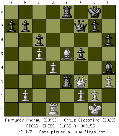 Last move : 1/2-1/2 2014 October 13 21:32:12 [Event "FICGS__CHESS__CLASS_A__000155"] [Site "FICGS"] [Date "2014.09.15"] [Round "1"] [White "Permykov,Andrey"] [Black "Ortiz,Clodomiro"] [Result "1/2-1/2"] [WhiteElo "2095"] [BlackElo "2029"] 1.e4 e5 2.Nf3 Nf6 3.d4 Nxe4 4.Bd3 d5 5.Nxe5 Nd7 6.Nxd7 Bxd7 7.O-O Bd6 8.c4 O-O 9.c5 Be7 10.Qc2 c6 11.Bxe4 dxe4 12.Qxe4 Re8 13.Qf3 Be6 14.Be3 Qd7 15.Nc3 Bg4 16.Qg3 Bf6 17.h3 Bh5 18.Rfe1 h6 19.Ne2 Bxe2 20.Rxe2 Re4 21.Rd2 Bh4 22.Qf3 Qd5 23.Rd3 Rd8 24.Rad1 f5 25.Bf4 Qxa2 26.Bc7 Rde8 27.Be5 Qf7 28.Re3 Rxe3 1/2-1/2 Petrov : Modern attack, Symmetrical variation Kingside Castling by player White (move 7) Kingside Castling by player Black (move 8) This chess game ended in a draw. Follow this game move after move (download)The chessboard is the world, the pieces are the phenomena of the Universe, the rules of the game are what we call the laws of Nature and the player on the other side is hidden from us. (Thomas Huxley) Schach ist gnadenlos. Du mußt bereit sein zu töten. (Nigel Short) Un jugador que es sorprendido, esta derrotado a medias. (Proverbio) Vous n'êtes pas toujours obligé de jouer le meilleur coup. Un coup doit être actif, entreprenant, correct et beau ! (David Bronstein) Either move or be moved. (Ezra Pound)