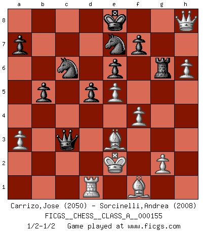 Last move : 1/2-1/2 2014 November 18 4:14:14 [Event "FICGS__CHESS__CLASS_A__000155"] [Site "FICGS"] [Date "2014.09.15"] [Round "1"] [White "Carrizo,Jose"] [Black "Sorcinelli,Andrea"] [Result "1/2-1/2"] [WhiteElo "2050"] [BlackElo "2008"] 1.e4 e6 2.d4 d5 3.Nc3 Bb4 4.e5 c5 5.a3 Bxc3+ 6.bxc3 Ne7 7.Qg4 cxd4 8.Qxg7 Rg8 9.Qxh7 Qc7 10.Ne2 Nbc6 11.f4 dxc3 12.h4 b6 13.Rh3 Ba6 14.Rxc3 Bc4 15.h5 b5 16.Rg3 Kd7 17.Rxg8 Rxg8 18.Be3 Ke8 19.c3 Qa5 20.h6 Bxe2 21.Kxe2 Qxc3 22.Rd1 Rg6 23.Qh8+ 1/2-1/2 French : Winawer, Advance, poisoned pawn variation This chess game ended in a draw. Follow this game move after move (download)Chess problems demand from the composer the same virtues that characterize all worthwhile art: originality, invention, conciseness, harmony, complexity, and splendid insincerity. (Vladimir Nabokov) Es gibt Leute, die glauben, alles wäre vernünftig, was man mit einem ernsthaften Gesicht tut. (Georg Christoph Lichtenberg) El pensamiento metódico es mas útil en el Ajedrez que la inspiración. (C. J. S. Purdy) Lorsque vous vous retrouvez devant une position atroce, ne tendez pas un ultime piège dérisoire avec l'intention d'abandonner si l'adversaire le déjoue ! Faites-vous plutôt un devoir de résister comme si votre vie en dépendait. Jouez le coup qui vous déplairait au centuple si vous étiez dans la peau de votre tortionnaire ! Luck is what you have left over after you give 100 percent. (Langston Coleman)