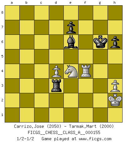 Last move : 1/2-1/2 2015 February 23 18:10:22 [Event "FICGS__CHESS__CLASS_A__000155"] [Site "FICGS"] [Date "2014.09.15"] [Round "1"] [White "Carrizo,Jose"] [Black "Tarmak,Mart"] [Result "1/2-1/2"] [WhiteElo "2050"] [BlackElo "2000"] 1.e4 d6 2.d4 Nf6 3.Nc3 g6 4.f4 Bg7 5.Nf3 O-O 6.Bd3 Nc6 7.e5 dxe5 8.fxe5 Ng4 9.Be4 f6 10.h3 Nh6 11.Qe2 Nf5 12.Qc4+ Kh8 13.Bxc6 bxc6 14.O-O c5 15.Qxc5 Bb7 16.e6 Qd6 17.Nb5 Qb6 18.c3 Rfc8 19.Qxb6 axb6 20.Bf4 Nd6 21.a4 Bd5 22.Rfe1 Kg8 23.Nd2 f5 24.g4 h6 25.gxf5 gxf5 26.Kh2 Kh7 27.Nf1 Kg6 28.Nd2 Bf6 29.Nxd6 cxd6 30.Re2 Ra5 31.Bg3 b5 32.Rg1 Kh7 33.Rf1 bxa4 34.Rxf5 Kg6 35.R5f2 a3 36.bxa3 Rxc3 37.Bxd6 Bh4 38.Bb4 Bxf2 39.Rxf2 R5xa3 40.Bxa3 Rxa3 41.Rf4 Rd3 42.Ne4 Bxe6 1/2-1/2 Pirc : Austrian attack, 6.Bd3 Kingside Castling by player Black (move 5) Kingside Castling by player White (move 14) 10 pieces endgame at move 42 : White KRNPP , Black KRBPP WHITE : King + 1 Rook 1 Knight 2 Pawns BLACK : King + 1 Rook 1 Bishop 2 Pawns This chess game ended in a draw. Follow this game move after move (download)Chess is everything: art, science and sport. (Anatoly Karpov) Ich war schon mal beim Dopingtest. Da musste ich Urin abgeben, während Dritte zusahen. (Elisabeth Pähtz) Un Peón pasado es un criminal, quién debe ser mantenido bajo candado y llave. Leves medidas, tales como vigilancia policiaca, no son suficientes. (Aaron Nimzovich) Nous sommes les pions de la mystérieuse partie d'Echecs jouée par Dieu. Il nous déplace, nous arrête, nous pousse encore, puis nous lance un à un dans la boîte du Néant. Epitaphe sur la tombe de David Janowsky (1868-1927). Political correctness is subjecting us to gross incompetence. (Johann Piek)