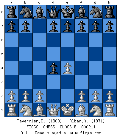 Last move : 0-1 2014 October 27 21:37:10 [Event "FICGS__CHESS__CLASS_B__000211"] [Site "FICGS"] [Date "2014.09.15"] [Round "1"] [White "Tavernier,Christopher"] [Black "Alban,Alexis"] [Result "0-1"] [WhiteElo "1800"] [BlackElo "1971"] 1.e4 c5 2.d4 cxd4 0-1 This chess game has been lost on time (started : 2014.09.15 21:6:40) Sicilian : Smith-Morra gambit Player Black won this chess game. Follow this game move after move (download)There are two classes of men; those who are content to yield to circumstances and who play whist; those who aim to control circumstances, and who play Chess. (Mortimer Collins) Fischer machte Schach einfach zu einer aufregenden Sache, wann immer er sich ans Brett setzte. (Raymond Keene) Uno no tiene que jugar muy bien, es suficiente jugar mejor que el oponente. (Siegbert Tarrasch) Soyez une menace à chaque fois que vous vous asseyez pour jouer. (Ken Smith) Chess is as much a mystery as women. (Purdy)