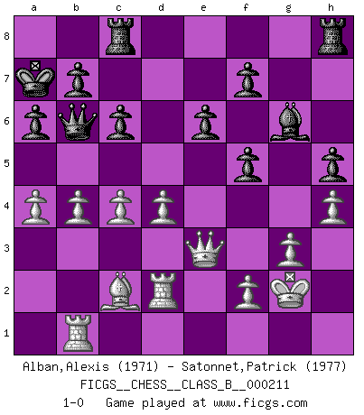 Last move : 1-0 2015 April 14 22:18:12 [Event "FICGS__CHESS__CLASS_B__000211"] [Site "FICGS"] [Date "2014.09.15"] [Round "1"] [White "Alban,Alexis"] [Black "Satonnet,Patrick"] [Result "1-0"] [WhiteElo "1971"] [BlackElo "1977"] 1.e4 d5 2.exd5 Qxd5 3.Nc3 Qa5 4.d4 Nf6 5.Nf3 Bf5 6.Bd2 c6 7.Bc4 e6 8.Nd5 Qd8 9.Nxf6+ gxf6 10.Bb3 Nd7 11.Qe2 Qc7 12.Nh4 Bg6 13.O-O O-O-O 14.Rfe1 Bd6 15.g3 f5 16.Ng2 Kb8 17.c3 Rhg8 18.Bg5 Rde8 19.Kh1 Rc8 20.Rad1 h6 21.Be3 Nf6 22.Bf4 Rcd8 23.Bxd6 Rxd6 24.Nf4 a6 25.Kg2 R6d8 26.Kf1 Rde8 27.a3 Ka7 28.c4 Ne4 29.Bc2 Qb6 30.Qe3 Rc8 31.Kg2 Nf6 32.b4 Nh5 33.Nxh5 Bxh5 34.Rd2 Rh8 35.Rb1 Bg6 36.a4 h5 37.h4 1-0 Scandinavian defense Kingside Castling by player White (move 13) Queenside Castling by player Black (move 13) Player White won this chess game. Follow this game move after move (download)You are for me the Queen on d8 and I am the Pawn on d7 !! (Eduard Gufeld) Ein Teil des Fehlers ist immer korrekt. (Savielly Grigorievitsch Tartakower) Debes de llevar a tu oponente hacia un profundo y obscuro bosque donde 2+2=5, y el camino que conduce a la salida es suficientemente ancho para solamente uno. (Mikhail Tal) Shah mat. Le roi est mort. Cri de fierté d'un joueur venant de terrasser son adversaire, courtoisement, sans effusion de sang. Knowledge rests not upon truth alone, but upon error also. (Carl G. Jung)