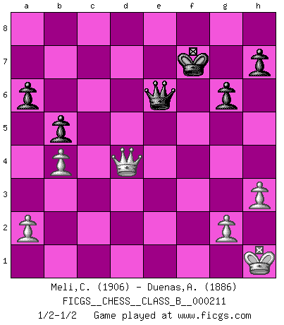 Last move : 1/2-1/2 2014 September 27 23:23:33 [Event "FICGS__CHESS__CLASS_B__000211"] [Site "FICGS"] [Date "2014.09.15"] [Round "1"] [White "Meli,Cosimo Leonardo"] [Black "Duenas,Alexis"] [Result "1/2-1/2"] [WhiteElo "1906"] [BlackElo "1886"] 1.e4 c5 2.Nf3 Nc6 3.d4 cxd4 4.Nxd4 e5 5.Nb5 d6 6.N1c3 a6 7.Na3 b5 8.Nd5 Nge7 9.c4 Nd4 10.Be3 Nxd5 11.cxd5 g6 12.Bd3 Bg7 13.O-O O-O 14.Nc2 Bd7 15.Rc1 Qb6 16.f4 Rae8 17.fxe5 dxe5 18.Nxd4 exd4 19.Bd2 Be5 20.Bh6 Qd6 21.h3 Bg7 22.Bxg7 Kxg7 23.Bb1 Qb6 24.Kh1 f5 25.exf5 Re5 26.Rf4 Rxd5 27.Qf3 Qd6 28.f6+ Kh8 29.Be4 Re5 30.Rf1 Re6 31.f7 Re7 32.Rf6 Qe5 33.Bd5 Bc8 34.b4 Kg7 35.Bb3 Be6 36.Bxe6 Rxe6 37.Rxe6 Qxe6 38.Qf4 Rxf7 39.Qxd4+ Kg8 40.Rxf7 Kxf7 1/2-1/2 Sicilian : Labourdonnais-Loewenthal (Kalashnikov) variation Kingside Castling by player White (move 13) Kingside Castling by player Black (move 13) This chess game ended in a draw. Follow this game move after move (download)Before the endgame, the Gods have placed the middle game. (Siegbert Tarrasch) Ich verstehe mehr vom Schach als irgendein anderer lebender Meister. (José Raúl Capablanca) Robert Fischer es la ley hacia si mismo. (Larry Evans) Tout change constamment, y compris dans le monde des Echecs. (Botvinnik) Life is the sum of all your choices. (Albert Camus)
