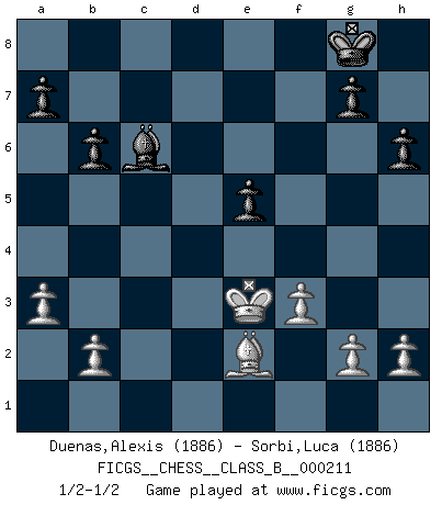 Last move : 1/2-1/2 2014 September 28 20:56:2 [Event "FICGS__CHESS__CLASS_B__000211"] [Site "FICGS"] [Date "2014.09.15"] [Round "1"] [White "Duenas,Alexis"] [Black "Sorbi,Luca"] [Result "1/2-1/2"] [WhiteElo "1886"] [BlackElo "1886"] 1.d4 Nf6 2.c4 e6 3.Nc3 Bb4 4.Qc2 O-O 5.a3 Bxc3+ 6.Qxc3 b6 7.Bg5 Bb7 8.f3 h6 9.Bh4 d5 10.e3 Nbd7 11.cxd5 Nxd5 12.Bxd8 Nxc3 13.Bh4 Nd5 14.Bf2 c5 15.e4 Ne7 16.Ne2 Rac8 17.Nc3 cxd4 18.Bxd4 Rfd8 19.Rd1 Nc5 20.Bf2 Bc6 21.Rxd8+ Rxd8 22.Be2 f5 23.exf5 Nxf5 24.O-O Rd2 25.Rb1 Nd3 26.Rd1 Rxd1+ 27.Nxd1 Nxf2 28.Kxf2 e5 29.Ne3 Nxe3 30.Kxe3 1/2-1/2 Nimzo-Indian : Classical variation Kingside Castling by player Black (move 4) Kingside Castling by player White (move 24) This chess game ended in a draw. Follow this game move after move (download)In a gambit you give up a Pawn for the sake of getting a lost game. (Samuel Standige Boden) Ich trinke, ich rauche, ich spiele, ich liebe Frauen aber Fernschach ist ein Laster, das ich nicht habe. (Mikhail Nekhemyevich Tal) Cuando tengas duda... ¡juega al Ajedrez!. (Tevis) Des points faibles ou des trous dans la position de l'adversaire doivent être occupés par des pièces et non pas par des pions. (Siegbert Tarrasch) The existence of forgetting has never been proved: We only know that some things don't come to mind when we want them. (Friedrich Nietzsche)