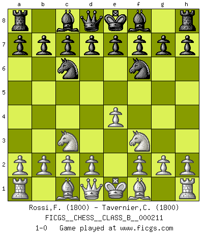 Last move : 1-0 2014 October 30 21:48:32 [Event "FICGS__CHESS__CLASS_B__000211"] [Site "FICGS"] [Date "2014.09.15"] [Round "1"] [White "Rossi,Fernando"] [Black "Tavernier,Christopher"] [Result "1-0"] [WhiteElo "1800"] [BlackElo "1800"] 1.e4 Nf6 2.Nc3 Nc6 3.Nf3 1-0 This chess game has been lost on time (started : 2014.09.15 21:6:40) Alekhine's defense Player White won this chess game. Follow this game move after move (download)A big shock; the best chess player in history has passed away. (Lajos Portisch, about Bobby Fischer's death) Mein Gehirn das ist mein zweitwichtigstes Organ [Aus dem Film: Der Schläfer]. (Woody Allen) No nos podemos resistir a la fascinación de un sacrificio ya que la pasión por los sacrificios es parte de la naturaleza de un jugador de Ajedrez. (Rudolf Spielman) La tactique, c'est ce que vous faites quand il y a quelque chose à faire; la stratégie, c'est ce que vous faites quand il n'y a rien à faire. (Savielli Tartacower) If you ain't just a little scared when you enter a casino, you are either very rich or you haven't studied the games enough. (Pappy)