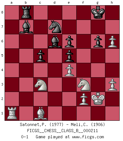Last move : 0-1 2015 June 17 13:28:7 [Event "FICGS__CHESS__CLASS_B__000211"] [Site "FICGS"] [Date "2014.09.15"] [Round "1"] [White "Satonnet,Patrick"] [Black "Meli,Cosimo Leonardo"] [Result "0-1"] [WhiteElo "1977"] [BlackElo "1906"] 1.d4 Nf6 2.c4 g6 3.Nc3 Bg7 4.e4 d6 5.Nf3 O-O 6.Be2 e5 7.O-O Nc6 8.d5 Ne7 9.Nd2 a5 10.a3 b6 11.Rb1 Bb7 12.b4 axb4 13.axb4 c6 14.Qc2 Qc7 15.Bb2 Bh6 16.Ra1 Rfc8 17.Qd3 Qd8 18.h3 Kg7 19.Rfd1 Rxa1 20.Rxa1 Bf4 21.g3 Bh6 22.Nf3 Ne8 23.Ra7 Rb8 24.Bd1 Kg8 25.Kg2 Nf6 26.Bb3 Qc7 27.g4 Qc8 28.Qd1 Bg7 29.c5 bxc5 30.bxc5 Nexd5 31.cxd6 Nf4+ 32.Kg3 Ne6 33.Bc4 c5 34.Bc1 Qd8 35.Qd3 h6 36.Kg2 Qb6 37.Ra1 Bf8 38.Bxe6 fxe6 39.g5 Nd7 40.gxh6 Qxd6 41.Qxd6 Bxd6 0-1 This chess game has been lost on time (started : 2014.09.15 21:6:40) King's Indian : Orthodox, Aronin-Taimanov variation (Yugoslav attack / Mar del Plata variation) Kingside Castling by player Black (move 5) Kingside Castling by player White (move 7) Player Black won this chess game. Follow this game move after move (download)At this time Fischer is simply a level above all the best Chessplayers in the world. (John Jacobs) Herr Iljumschinow ist ein etwas merkwürdiger Geschäftsmann: Er arbeitet zusammen mit Leuten wie Muammar al-Gaddafi; früher ist das Saddam Hussein gewesen. (Joel Lautier) El Ajedrez por encima de todo... ¡es una pelea!. (Emanuel Lasker) Psychologiquement, tu dois avoir confiance en toi même, mais cette confiance doit être basée sur des faits. (Robert Fischer) Life doesn't imitate art, it imitates bad television. (Woody Allen)