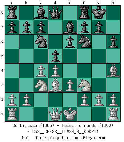 Last move : 1-0 2014 October 28 21:45:55 [Event "FICGS__CHESS__CLASS_B__000211"] [Site "FICGS"] [Date "2014.09.15"] [Round "1"] [White "Sorbi,Luca"] [Black "Rossi,Fernando"] [Result "1-0"] [WhiteElo "1886"] [BlackElo "1800"] 1.d4 Nf6 2.c4 e6 3.Nf3 d5 4.Nc3 Nc6 5.Bg5 Be7 6.e3 O-O 7.Bd3 h6 8.Bh4 1-0 This chess game has been lost on time (started : 2014.09.15 21:6:40) Queen's pawn game Kingside Castling by player Black (move 6) Player White won this chess game. Follow this game move after move (download)If your opponent offers you a draw, try to work out why he thinks he's worse off. (Nigel Short) Ein typischer, sehr verbreiteter Gedankenschädling ist der, daß der betreffende Amateur von der Annanhme ausgeht, daß jeder einzelne Zug etwas zu leisten habe. (Aaron Nimzowitsch) No hay precio que sea tan grande por la cabellera del Rey enemigo. (Koblentz) A chaque perte on perd un peu de soi. (Joël Lautier) I know the human being and fish can coexist peacefully. (George W. Bush, Saginaw sept. 29, 2000)