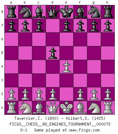 Last move : 0-1 2014 November 8 10:14:58 [Event "FICGS__CHESS__NO_ENGINES_TOURNAMENT__000073"] [Site "FICGS"] [Date "2014.09.16"] [Round "1"] [White "Tavernier,Christopher"] [Black "Hilbert,Stephan J."] [Result "0-1"] [WhiteElo "1800"] [BlackElo "1425"] 1.e4 d5 0-1 This chess game has been lost on time (started : 2014.09.16 0:34:22) Scandinavian (centre counter) defense Player Black won this chess game. Follow this game move after move (download)The way he plays Chess demonstrates a man's whole nature. (Stanley Ellin) Man braucht nicht immer den besten Zug zu spielen: Ein Zug muß aktiv, unternehmungslustig, korrekt und schön sein. (David Bronstein) Fischer no está bajo la obligación de nadie. (Joseph Platz) Le succès, c'est être capable d'aller d'échec en échec sans perdre son enthousiasme. (Winston Churchill) The man who strikes first admits that his ideas have given out. (Chinese proverb)