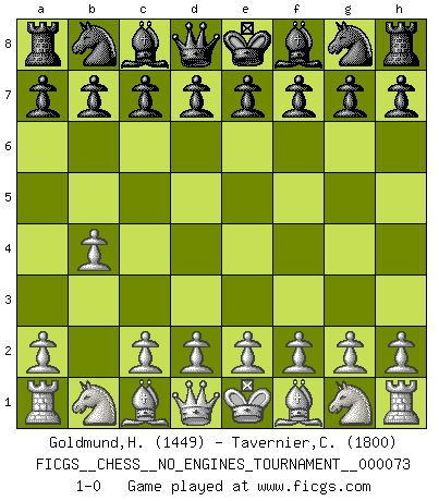 Last move : 1-0 2014 November 2 22:5:53 [Event "FICGS__CHESS__NO_ENGINES_TOURNAMENT__000073"] [Site "FICGS"] [Date "2014.09.16"] [Round "1"] [White "Goldmund,Heike"] [Black "Tavernier,Christopher"] [Result "1-0"] [WhiteElo "1449"] [BlackElo "1800"] 1.b4 1-0 This chess game has been lost on time (started : 2014.09.16 0:34:22) Polish (Sokolsky) opening Player White won this chess game. Follow this game move after move (download)The passed Pawn is a criminal, who should be kept under lock and key. Mild measures, such as police surveillance, are not sufficient. (Aaron Nimzovich) Ein Isolani verdüstert die Stimmung auf dem ganzen Schachbrett. (Savielly Grigorievitsch Tartakower) Preferería tener un Peón que un dedo. (Reuben Fine) Les pièces de l'échiquier étaient impitoyables. Elles le retenaient, elles l'absorbaient. Il y avait de l'horreur en cela, mais aussi une harmonie unique. Car, qu'y a-t-il dans le monde, à part les échecs ? (V. Nabokov) Perhaps chess is the wrong game for the times (The Chess Master and the Computer, by Garry Kasparov - 2010)