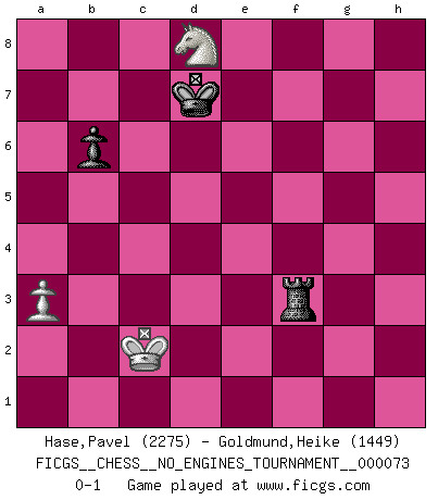 Last move : 0-1 2015 April 23 16:21:21 [Event "FICGS__CHESS__NO_ENGINES_TOURNAMENT__000073"] [Site "FICGS"] [Date "2014.09.16"] [Round "1"] [White "Hase,Pavel"] [Black "Goldmund,Heike"] [Result "0-1"] [WhiteElo "2275"] [BlackElo "1449"] 1.e4 d5 2.exd5 Qxd5 3.Nc3 Qa5 4.d4 Nf6 5.Bd2 c6 6.Ne4 Qc7 7.Nxf6+ gxf6 8.g3 Bf5 9.Bg2 Nd7 10.Bc3 O-O-O 11.Qe2 Nb6 12.O-O-O Nd5 13.Bd2 e6 14.a3 Rg8 15.c4 Nb6 16.Nf3 e5 17.Be3 Be6 18.dxe5 fxe5 19.Rxd8+ Kxd8 20.Rd1+ Kc8 21.Bxb6 axb6 22.Qxe5 Qxe5 23.Nxe5 Bc5 24.Rd2 Kc7 25.Bf1 Rd8 26.f4 Be3 27.Bd3 Bxd2+ 28.Kxd2 f6 29.Nf3 Bf5 30.Ne1 Bxd3 31.Nxd3 Rd4 32.b3 Kd6 33.Ke3 c5 34.g4 h6 35.h4 Kc6 36.g5 fxg5 37.hxg5 hxg5 38.fxg5 Kd6 39.Nf4 Ke5 40.Ne2 Rg4 41.b4 Rxg5 42.Kd3 Rf5 43.Nc3 Rf3+ 44.Kc2 Kd4 45.Nb5+ Kxc4 46.Nd6+ Kd4 47.bxc5 Kxc5 48.Nxb7+ Kc6 49.Nd8+ Kd7 0-1 Scandinavian (centre counter) defense Queenside Castling by player Black (move 10) Queenside Castling by player White (move 12) 10 pieces endgame at move 41 : White KNPPP , Black KRPPP WHITE : King + 1 Knight 3 Pawns BLACK : King + 1 Rook 3 Pawns 9 pieces endgame at move 45 : White KNPP , Black KRPPP WHITE : King + 1 Knight 2 Pawns BLACK : King + 1 Rook 3 Pawns 8 pieces endgame at move 47 : White KNPP , Black KRPP WHITE : King + 1 Knight 2 Pawns BLACK : King + 1 Rook 2 Pawns 7 pieces endgame at move 47 : White KNP , Black KRPP WHITE : King + 1 Knight 1 Pawn BLACK : King + 1 Rook 2 Pawns 6 pieces endgame at move 48 : White KNP , Black KRP WHITE : King + 1 Knight 1 Pawn BLACK : King + 1 Rook 1 Pawn Player Black won this chess game. Follow this game move after move (download)Every Chess master was once a beginner. (Chernev) Kostenjuk hat keinen Sexappeal. (Loek van Wely) Hasta este punto, las blancas han seguido un análisis bien conocido. Pero ahora el hace un error fatal: empieza a usar su propia cabeza. (Siegbert Tarrasch) Votre seul travail dans les ouvertures est d'obtenir un milieu de partie jouable. (Lajos Portish) The absolute truth is the thing that makes people laugh. (Carl Reiner)