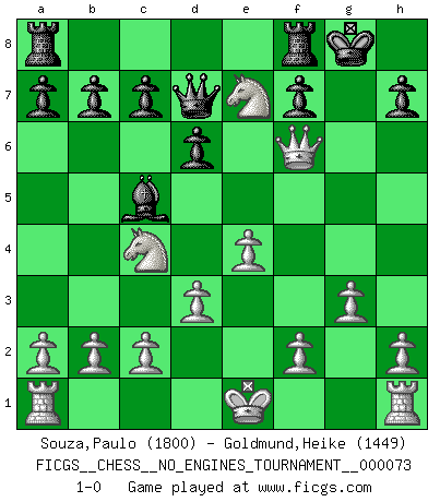Last move : 1-0 2014 October 27 19:40:7 [Event "FICGS__CHESS__NO_ENGINES_TOURNAMENT__000073"] [Site "FICGS"] [Date "2014.09.16"] [Round "1"] [White "Souza,Paulo"] [Black "Goldmund,Heike"] [Result "1-0"] [WhiteElo "1800"] [BlackElo "1449"] 1.e4 e5 2.Nf3 Nc6 3.Nc3 Bc5 4.d3 Nf6 5.Bg5 O-O 6.g3 Nd4 7.Nxe5 d6 8.Nc4 Bg4 9.Be2 Nf3+ 10.Bxf3 Qd7 11.Bxf6 Bxf3 12.Qxf3 gxf6 13.Nd5 Kg7 14.Qxf6+ Kg8 15.Ne7+ 1-0 Three knights game Kingside Castling by player Black (move 5) Player White won this chess game. Follow this game move after move (download)I'm not a materialistic person, in that, I don't suffer the lack or loss of money. The absence of worldly goods I don't look back on. For Chess is a way I can be as materialistic as I want without having to sell my soul. (Jamie Walter Adams) Schach ist mein Leben, meine Leidenschaft, was ich gelernt habe und seit meinem 14. Lebensjahr profimässig praktiziere. Darauf zu verzichten, würde mir sehr schwer fallen. (Viktor Kortschnoi) Cuando tu no sabes absolutamente que mas hacer, es tiempo de entrar en pánico. (John van der Wiel) Aux échecs, les retours au sommet sont rares : les dommages psychologiques consécutifs à une défaite sont trop sévères. (Daily Telegraph) If computers get too powerful, we can organize them into committees. That'll do them in. (Anonymous)