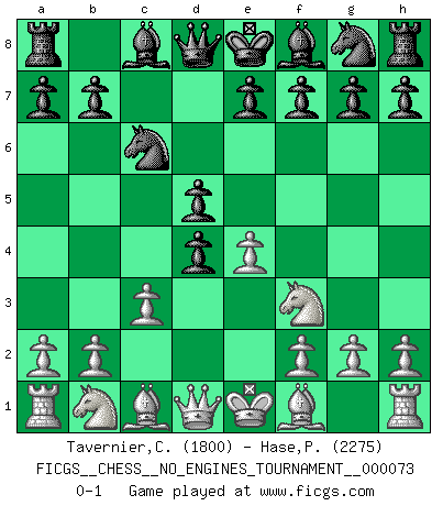 Last move : 0-1 2014 October 29 21:46:30 [Event "FICGS__CHESS__NO_ENGINES_TOURNAMENT__000073"] [Site "FICGS"] [Date "2014.09.16"] [Round "1"] [White "Tavernier,Christopher"] [Black "Hase,Pavel"] [Result "0-1"] [WhiteElo "1800"] [BlackElo "2275"] 1.e4 c5 2.d4 cxd4 3.c3 Nc6 4.Nf3 d5 0-1 This chess game has been lost on time (started : 2014.09.16 0:34:22) Sicilian : Smith-Morra gambit Player Black won this chess game. Follow this game move after move (download)One bad move nullifies forty good ones. (Horowitz) Nicht daß Diemer aus Opportunismus Mitglied der NSDAP geworden wäre. Er war ein Fanatiker, in allem, was er tat. (Hans Ree) No hay precio que no valga la pena por la cabellera del Rey enemigo. (Koblentz) La tactique, c'est ce que vous faites quand il y a quelque chose à faire; la stratégie, c'est ce que vous faites quand il n'y a rien à faire. (Savielli Tartacower) I couldn't make any sense out of what this particular thread is about. It sounds like R2 D2 computer speaking. A space fight ?!? Some 'command' problems in Moscow ? Some killers & narcotic addicts attacking some game & a god wannabe ?? (Dinesh De Silva, lost in a russian conflict in FICGS forum)