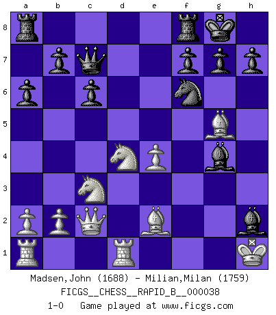 Last move : 1-0 2007 April 16 17:15:3 [Event "FICGS__CHESS__RAPID_B__000038"] [Site "FICGS"] [Date "2007.02.21"] [Round "1"] [White "Madsen,John"] [Black "Milian,Milan"] [Result "1-0"] [WhiteElo "1688"] [BlackElo "1759"] 1.c4 c6 2.d4 d5 3.Nf3 Nf6 4.Nc3 e6 5.e3 Nbd7 6.Be2 Bd6 7.Qc2 O-O 8.O-O dxc4 9.Bxc4 a6 10.e4 e5 11.Rd1 exd4 12.Nxd4 Qc7 13.g3 Ne5 14.Be2 Neg4 15.f3 Bxg3 16.fxg4 Bxh2+ 17.Kh1 Bxg4 18.Bg5 1-0 This chess game has been lost on time (started : 2007.02.21 14:0:13) English : Caro-Kann defensive system Kingside Castling by player Black (move 7) Kingside Castling by player White (move 8) Player White won this chess game. Follow this game move after move (download)Of Chess it has been said that life is not long enough for it, but that is the fault of life, not Chess. (William Ewart Napier) Offener Brief an US-Präsident Bush anlässlich der Verhaftung Bobby Fishers: Verhaften Sie mich. Stecken Sie mich in dieselbe Zelle wie Bobby Fisher und geben Sie uns ein Schachspiel mit. (Boris Vassilievich Spassky) Morphy probablemente fue el genio más grande de todos. (Bobby Fischer) Vous savez, camarade Pachman, je n'éprouve pas de plaisir à être ministre, je jouerais plutôt aux échecs comme vous, ou alors ferais une révolution au Venezuela. (Che Guevara à Ludek Pachman, 'Checkmate in Prague', 1975) Art is the only way to run away without leaving home. (Twyla Tharp)