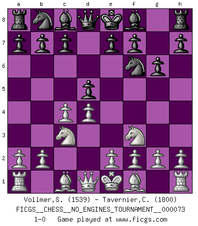 Last move : 1-0 2014 October 26 9:35:42 [Event "FICGS__CHESS__NO_ENGINES_TOURNAMENT__000073"] [Site "FICGS"] [Date "2014.09.16"] [Round "1"] [White "Vollmer,Steve"] [Black "Tavernier,Christopher"] [Result "1-0"] [WhiteElo "1539"] [BlackElo "1800"] 1.d4 Nf6 2.c4 g6 3.Nc3 d5 4.Nf3 1-0 This chess game has been lost on time (started : 2014.09.16 0:34:22) King's Indian defense, 3.Nc3 Player White won this chess game. Follow this game move after move (download)Nowadays, when you're not a grandmaster at 14, you can forget about it. (Anand Viswanathan) Wenn Spassky eine Figur opfert kannst du genauso gut aufgeben. Aber wenn Tal eine Figur opfert, spiel weiter. Er könnte noch eine weitere opfern, und dann ... wer weiß? (Miguel Najdorf) Todavía soy una víctima del Ajedrez. Tiene toda la belleza del arte y mucho mas. No puede ser comercializado. El Ajedrez es mas puro que el arte en su posición social. (Marcel Duchamp) Les Cavaliers se révèlent fort utiles dans les positions fermées. D'habitude, les Fous sont un peu plus forts que les Cavaliers dans les positions ouvertes. Qu'on le veuille ou non, il restera toujours des exceptions ! You lose, general Kenobi. (General Grievous in Star Wars ep.3)
