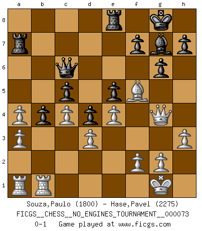 Last move : 0-1 2015 January 31 6:37:1 [Event "FICGS__CHESS__NO_ENGINES_TOURNAMENT__000073"] [Site "FICGS"] [Date "2014.09.16"] [Round "1"] [White "Souza,Paulo"] [Black "Hase,Pavel"] [Result "0-1"] [WhiteElo "1800"] [BlackElo "2275"] 1.e4 c5 2.Nf3 d6 3.b3 Nc6 4.Bb2 Nf6 5.d3 e5 6.Nbd2 Be7 7.Be2 O-O 8.O-O Bg4 9.c3 d5 10.Re1 d4 11.Nc4 Bxf3 12.Bxf3 b5 13.Nd2 Qd7 14.c4 b4 15.Nf1 Rfe8 16.Ng3 a5 17.Nf5 Bf8 18.h3 Ne7 19.Bg4 Qc6 20.Bc1 a4 21.Bg5 Nxf5 22.Bxf5 Ra6 23.Bxf6 Qxf6 24.bxa4 Qc6 25.Qg4 Ra7 26.Reb1 g6 27.a3 Bg7 0-1 Sicilian Kingside Castling by player Black (move 7) Kingside Castling by player White (move 8) Player Black won this chess game. Follow this game move after move (download)The battle for the ultimate truth will never be won. And that's why Chess is so fascinating. (Hans Kmoch) Ich verstehe mehr vom Schach als irgendein anderer lebender Meister. (José Raúl Capablanca) Una partida de Ajedrez se divide en 3 etapas: la primera cuando piensas que tienes la ventaja, la segunda cuando crees que tienes la ventaja y la tercera... ¡cuando te das cuenta que vas a perder!. (Savielly Tartakower) Même si l'adversaire joue le coup analysé précédemment, recommencez l'analyse en voyant la nouvelle position. Première règle de Blumenfeld A good programmer is someone who always looks both ways before crossing a one-way street. (Doug Linder)