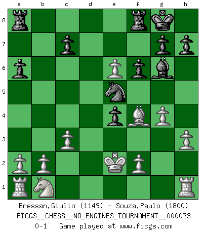 Last move : 0-1 2015 January 8 16:20:7 [Event "FICGS__CHESS__NO_ENGINES_TOURNAMENT__000073"] [Site "FICGS"] [Date "2014.09.16"] [Round "1"] [White "Bressan,Giulio"] [Black "Souza,Paulo"] [Result "0-1"] [WhiteElo "1149"] [BlackElo "1800"] 1.e4 e5 2.Nf3 Nc6 3.Bc4 Nf6 4.d3 d5 5.Bb5 a6 6.Bxc6+ bxc6 7.Nxe5 dxe4 8.d4 Bb4+ 9.c3 Bd6 10.Nxc6 Qd7 11.Ne5 Bxe5 12.dxe5 Qxd1+ 13.Kxd1 Bg4+ 14.Ke1 Nd7 15.Bf4 O-O 16.h3 Bh5 17.g4 Bg6 18.Ke2 f6 19.e6 Ne5 0-1 This chess game has been lost on time (started : 2014.09.16 0:34:22) Two knights defense (Modern Bishop's Opening) Kingside Castling by player Black (move 15) Player Black won this chess game. Follow this game move after move (download)I have never in my life played the French Defence, which is the dullest of all openings. (Wilhelm Steinitz) Gott hat gewollt, dass ich Champion werde. (Surab Azmajparaschvili) Aquellos que dicen que entienden al Ajedrez, no entienden nada. (Robert Hubner) A chaque perte on perd un peu de soi. (Joël Lautier) If only faces could talk... (Pat Summerall, Sportscaster during the Super Bowl)