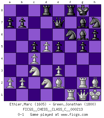 Last move : 0-1 2015 June 14 11:14:42 [Event "FICGS__CHESS__CLASS_C__000213"] [Site "FICGS"] [Date "2014.09.16"] [Round "1"] [White "Ethier,Marc"] [Black "Green,Jonathan"] [Result "0-1"] [WhiteElo "1605"] [BlackElo "1800"] 1.d4 f5 2.Bf4 Nf6 3.e3 g6 4.h4 h6 5.c4 d6 6.Nc3 Bg7 7.Nf3 c6 8.Be2 Be6 9.O-O O-O 10.Qb3 Qb6 11.Qc2 Nbd7 12.Rad1 Nh5 13.Bh2 Ndf6 14.Nd2 Qd8 15.f3 Qe8 16.Rde1 Qd7 17.Qd1 Nh7 18.Nb3 Bf7 19.g4 N5f6 20.gxf5 Qxf5 21.Rf2 Qh3 22.Rg2 Qxh4 23.f4 g5 24.Nd2 Qh3 25.Rg3 Qd7 26.Kh1 Kh8 27.Rg2 Rad8 28.Reg1 Bg6 29.Qe1 Qh3 30.Rf1 c5 31.d5 e5 32.fxe5 dxe5 33.Rf3 Qd7 34.Qg1 Qe7 35.Rf1 Kg8 0-1 Dutch Kingside Castling by player White (move 9) Kingside Castling by player Black (move 9) Player Black won this chess game. Follow this game move after move (download)Good offense and good defense both begin with good development. (Bruce A. Moon) Schach ist ein Kampf gegen den Fehler. (Johannes Herrman Zukertort) Dios mío, Bobby Fischer juega tan simple. (Alexei Suetin) On est toujours la mazette de quelqu'un d'autre. (Anonyme) Go and wake up your luck. (Persian saying)