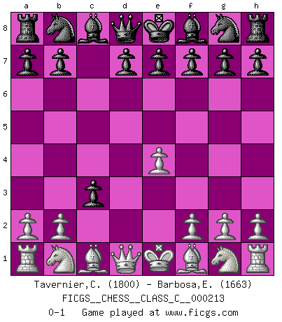 Last move : 0-1 2014 October 27 9:36:7 [Event "FICGS__CHESS__CLASS_C__000213"] [Site "FICGS"] [Date "2014.09.16"] [Round "1"] [White "Tavernier,Christopher"] [Black "Barbosa,Edinardo"] [Result "0-1"] [WhiteElo "1800"] [BlackElo "1663"] 1.e4 c5 2.d4 cxd4 3.c3 dxc3 0-1 This chess game has been lost on time (started : 2014.09.16 12:2:34) Sicilian : Smith-Morra gambit Player Black won this chess game. Follow this game move after move (download)A thorough understanding of the typical mating continuations makes the most complicated sacrificial combinations leading up to them not only not difficult, but almost a matter of course. (Siegbert Tarrasch) Jeder weiß, dass Gasprom Putins persönliches Machtinstrument ist. Die Firma wird vom Kreml aus geleitet und wird schon deshalb nie transparent sein. (Garry Kasparov) Si pudieramos observar el interior de la cabeza de un jugador de Ajedrez, encontraríamos ahí un mundo lleno de sentimientos, imágenes, ideas, emoción y pasión. (Alfred Binet) Votre seul travail dans les ouvertures est d'obtenir un milieu de partie jouable. (Lajos Portish) A cynic is a man who knows the price of everything but the value of nothing. (Oscar Wilde)