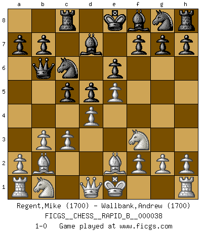 Last move : 1-0 2007 April 16 5:14:13 [Event "FICGS__CHESS__RAPID_B__000038"] [Site "FICGS"] [Date "2007.02.21"] [Round "1"] [White "Regent,Mike"] [Black "Wallbank,Andrew"] [Result "1-0"] [WhiteElo "1700"] [BlackElo "1700"] 1.e4 e6 2.d4 d5 3.e5 c5 4.c3 Qb6 5.Nf3 Bd7 6.b3 Nc6 7.Bb2 Rc8 8.Be2 1-0 This chess game has been lost on time (started : 2007.02.21 14:0:13) French : Advance, Wade variation Player White won this chess game. Follow this game move after move (download)Chess is life. (Bobby Fischer) Wenn Schach ein enormer Dschungel ist, der seine Myriaden von Geheimnissen nicht preisgeben will, dann sind Computer die Kettensägen einer gewaltigen ökologisch unsensiblen Nutzholzfirma. (Nigel Short) Una mala movida nulifica cuarenta buenas. (Horowitz) Shah mat. Le roi est mort. Cri de fierté d'un joueur venant de terrasser son adversaire, courtoisement, sans effusion de sang. I feel so... helpless. (C-3PO in Star Wars ep.3)