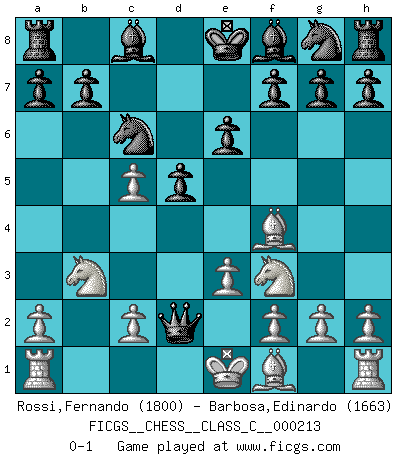 Last move : 0-1 2014 October 29 21:46:30 [Event "FICGS__CHESS__CLASS_C__000213"] [Site "FICGS"] [Date "2014.09.16"] [Round "1"] [White "Rossi,Fernando"] [Black "Barbosa,Edinardo"] [Result "0-1"] [WhiteElo "1800"] [BlackElo "1663"] 1.d4 d5 2.Nf3 e6 3.Bf4 c5 4.e3 Nc6 5.Nbd2 Qb6 6.dxc5 Qxb2 7.Nb3 Qc3+ 8.Qd2 Qxd2+ 0-1 This chess game has been lost on time (started : 2014.09.16 12:2:34) Queen's pawn game Player Black won this chess game. Follow this game move after move (download)Chess is above all, a fight ! (Emanuel Lasker) Ein bischen Romantik kann weder im Schach noch in der Liebe schaden. Also versuche ich mich ab und zu daran zu erinnern. (Nigel Short) Aquellos que dicen que entienden al Ajedrez, no entienden nada. (Robert Hubner) Ce qui caractérise les parties de combat, c'est que si le défenseur a constamment de difficiles problèmes à résoudre, l'attaquant doit chercher sans relâche de nouvelles possibilités d'attaque. (Koblentz) Industry executives and analysts often mistakenly talk about strategy as if it were some kind of chess match. But in chess, you have just two opponents, each with identical resources, and with luck playing a minimal role. The real world is much more like a poker game, with multiple players trying to make the best of whatever hand fortune has dealt them. In our industry, Bill Gates owns the table until someone proves otherwise. (David Moschella, 'Computerworld')
