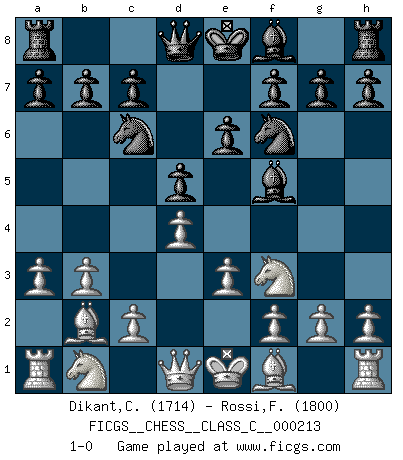 Last move : 1-0 2014 October 30 21:48:32 [Event "FICGS__CHESS__CLASS_C__000213"] [Site "FICGS"] [Date "2014.09.16"] [Round "1"] [White "Dikant,Christophe"] [Black "Rossi,Fernando"] [Result "1-0"] [WhiteElo "1714"] [BlackElo "1800"] 1.d4 d5 2.Nf3 Nc6 3.e3 Nf6 4.b3 Bf5 5.a3 e6 6.Bb2 1-0 This chess game has been lost on time (started : 2014.09.16 12:2:34) Queen's pawn game, Chigorin variation Player White won this chess game. Follow this game move after move (download)Chess is so inspiring that I do not believe a good player is capable of having an evil thought during the game. (Wilhelm Steinitz) Der zweitbeste Zug ist oft der einzig richtige. (Savielly Grigorievitsch Tartakower) EL Ajedrez es como la vida. (Boris Spassky) Si rien de grave n'est détecté lors de l'analyse d'une position, on joue alors le coup. Seconde règle de Blumenfeld. You must have a dream in order to have it come true. (A.P.J. Kalam)
