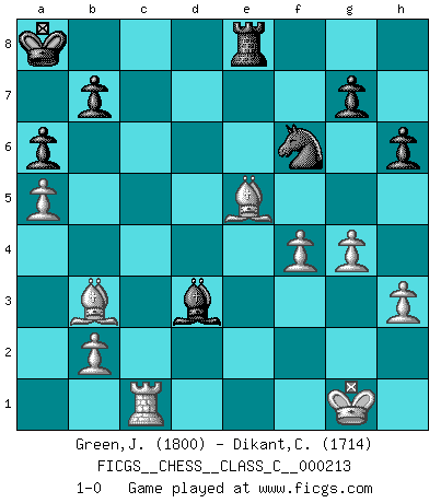 Last move : 1-0 2015 April 25 8:19:0 [Event "FICGS__CHESS__CLASS_C__000213"] [Site "FICGS"] [Date "2014.09.16"] [Round "1"] [White "Green,Jonathan"] [Black "Dikant,Christophe"] [Result "1-0"] [WhiteElo "1800"] [BlackElo "1714"] 1.e4 d5 2.exd5 Nf6 3.Nf3 Bg4 4.Bb5+ Nbd7 5.h3 Bh5 6.Nc3 a6 7.Be2 Nb6 8.O-O Nfxd5 9.Nxd5 Qxd5 10.a4 e6 11.a5 Nd7 12.c4 Qd6 13.d4 c5 14.d5 exd5 15.Re1 O-O-O 16.cxd5 Nf6 17.Bg5 Qxd5 18.Qxd5 Rxd5 19.g4 Bg6 20.Bc4 Rd8 21.Ne5 Bd6 22.Bxf7 Bxe5 23.Be6+ Kb8 24.Rxe5 Rhe8 25.Rae1 h6 26.Bf4 Ka8 27.Rxc5 Ne4 28.Re5 Nf6 29.Bb3 Rxe5 30.Bxe5 Re8 31.f4 Bd3 32.Rc1 1-0 Scandinavian defense Kingside Castling by player White (move 8) Queenside Castling by player Black (move 15) Player White won this chess game. Follow this game move after move (download)Chess is a more highly symbolic game, but the aggressions are therefore even more frankly represented in the play. It probably began as a war game; that is, the representation of a miniature battle between the forces of two kingdoms. (Karl Meninger) Dieses schreckliche Gefühl, dass ich gegen eine Maschine spielte, die niemals Fehler macht, zerschmetterte meinen Widerstand. (Mark Taimanov) No hay otro maestro que tenga una voluntad terrífica de ganar. Al tablero, el irradía peligro y aún los oponentes mas fuertes tienden a congelarse como liebres cuando olfatean a una pantera. Aún sus debilidades son peligrosas. Con las blancas, su juego de apertura es predecible - te es posible hacer planes en su contra - pero es tan fuerte que tus planes casi nunca funcionan. En el juego medio, su precisión e invención son fabulosas y en finales, tú simplemente no le puedes vencer. (Experto Alemán anónimo) On croit qu'il y a plus de mauvais joueurs que de bons joueurs, c'est faux : Il y a autant de joueurs qui gagnent que de joueurs qui perdent. (Philippe Geluck) Better than a thousand days of diligent study is one day with a great teacher. (Japanese proverb)