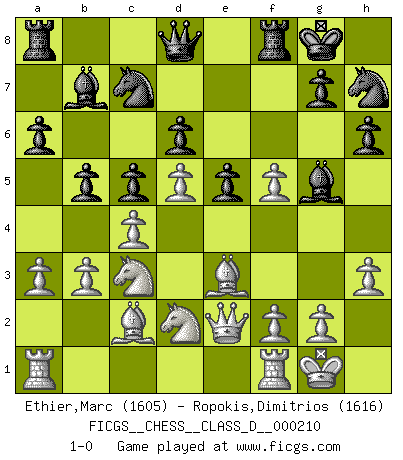 Last move : 1-0 2015 April 1 17:3:30 [Event "FICGS__CHESS__CLASS_D__000210"] [Site "FICGS"] [Date "2014.09.17"] [Round "1"] [White "Ethier,Marc"] [Black "Ropokis,Dimitrios"] [Result "1-0"] [WhiteElo "1605"] [BlackElo "1616"] 1.e4 b6 2.d4 Bb7 3.Bd3 e6 4.c4 c5 5.d5 d6 6.Nc3 Nf6 7.Nf3 Be7 8.O-O O-O 9.a3 Na6 10.Bc2 e5 11.Be3 h6 12.Nd2 Nc7 13.h3 Nh7 14.Ba4 Bg5 15.Qe2 f5 16.exf5 a6 17.Bc2 b5 18.b3 1-0 This chess game has been lost on time (started : 2014.09.17 15:11:2) Owen defense Kingside Castling by player White (move 8) Kingside Castling by player Black (move 8) Player White won this chess game. Follow this game move after move (download)Capture of the adverse King is the ultimate but not the first object of the game. (William Steinitz) Nur ein wirklich starker Spieler weiß wie schwach er spielt. (Savielly Grigorievitsch Tartakower) Los Peones son el alma de una partida de Ajedrez. (Francois Andre Danican Philidor) Les Echecs sont et restent toujours un combat, un combat intégral comme la boxe, la lutte ou un autre sport, et où il doit y avoir un vainqueur et un vaincu. (Joseph Emil Diemer) Statistics can be made to prove anything - even the truth. (Author unknown)