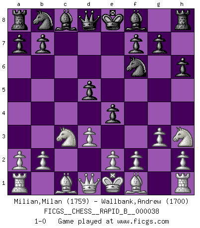 Last move : 1-0 2007 April 8 22:22:18 [Event "FICGS__CHESS__RAPID_B__000038"] [Site "FICGS"] [Date "2007.02.21"] [Round "1"] [White "Milian,Milan"] [Black "Wallbank,Andrew"] [Result "1-0"] [WhiteElo "1759"] [BlackElo "1700"] 1.c4 e5 2.Nc3 Nf6 3.g3 c6 4.Nf3 e4 5.Ng5 d5 6.cxd5 cxd5 7.d3 h6 8.Nh3 1-0 This chess game has been lost on time (started : 2007.02.21 14:0:13) English : Bremen system, Keres variation Player White won this chess game. Follow this game move after move (download)If Chess is a science, it's a most inexact one. If Chess is an art, it is too exacting to be seen as one. If Chess is a sport, it's too esoteric. If Chess is a game, it's too demanding to be just a game. If Chess is a mistress, she's a demanding one. If Chess is a passion, it's a rewarding one. If Chess is life, it's a sad one. (Unknown) Man wirke der falschen Auffassung entgegen, als ob jeder Zug Unmittelbares zu leisten habe; auch Werte- und Ruhezüge haben ihre Existenzberechtigung. (Aaron Nimzowitsch) Peones: ellos son el alma de esta partida, solos forman el ataque y la defensa. (Philidor) Aucun coup ne doit être joué sans but. (Pedro Damiano) Some people are so afraid to die that they never begin to live. (Henry Van Dyke)