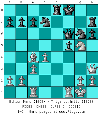 Last move : 1-0 2014 December 8 7:5:14 [Event "FICGS__CHESS__CLASS_D__000210"] [Site "FICGS"] [Date "2014.09.17"] [Round "1"] [White "Ethier,Marc"] [Black "Trigance,Emile"] [Result "1-0"] [WhiteElo "1605"] [BlackElo "1573"] 1.f4 e5 2.fxe5 d6 3.exd6 Bxd6 4.Nf3 g5 5.d4 g4 6.Ng5 f5 7.e4 h6 8.e5 Be7 9.Nh3 gxh3 10.Qh5+ Kf8 11.Bc4 Rh7 12.c3 Bg5 13.Nd2 Bd7 14.Qxh3 Ne7 15.Nf3 Bxc1 16.Rxc1 Ng6 17.e6 Qf6 18.exd7 Nxd7 19.O-O Re8 20.Ng5 1-0 Bird : From gambit, Lasker variation Kingside Castling by player White (move 19) Player White won this chess game. Follow this game move after move (download)A great player and a great example for many. His book My 60 Memorable Games had a big impact on me. It is a shame he didn't continue to enrich the world of chess with his unparalleled understanding after 1972. (Jan Timman, about Bobby Fischer's death) Als er Schachweltmeister wurde ließ er praktisch alle stärksten Sovietspieler für sich arbeiten. Wenn ein auch nur mittelmässiger Meister ein Spezialist für eine bestimmte Eröffnung war, wurde er von Karpov gerufen. Das wurde alles geheim gehalten. (Mikhail Moiseyevich Botvinik) El hombre es un frívolo, una creatura engañosa y como un jugador de Ajedrez, se preocupa mas por el proceso de obtener su meta que de la meta por sí misma. (Dostoyevsky) J'ai vu le vaincu d'Echecs jouer des années durant dans l'espoir de la fête de la victoire. Car tu es plus riche de ce qu'elle existe si même elle n'est point pour toi. Ainsi de la perle du fond des mers. (Antoine de Saint-Exupéry) Creativity is inventing, experimenting, growing, taking risks, breaking rules, making mistakes, and having fun. (Mary Lou Cook)