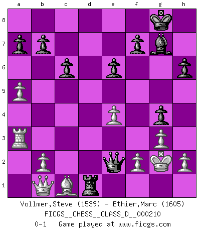 Last move : 0-1 2015 February 21 18:14:12 [Event "FICGS__CHESS__CLASS_D__000210"] [Site "FICGS"] [Date "2014.09.17"] [Round "1"] [White "Vollmer,Steve"] [Black "Ethier,Marc"] [Result "0-1"] [WhiteElo "1539"] [BlackElo "1605"] 1.d4 d5 2.c4 c6 3.Nf3 Nf6 4.g3 dxc4 5.Bg2 g6 6.Nc3 Bg7 7.O-O O-O 8.Bg5 Bf5 9.Ne5 h6 10.Bc1 e6 11.a4 Nbd7 12.Nxc4 g5 13.Nd6 Bh7 14.a5 Qc7 15.Nde4 Nxe4 16.Nxe4 Rfd8 17.Qb3 Bxd4 18.Rd1 Bxe4 19.Bxe4 Nc5 20.Qc2 Nxe4 21.e3 Bg7 22.Rxd8+ Qxd8 23.Qxe4 Qd1+ 24.Kg2 Rd8 25.Qb1 Qe2 26.e4 Rd1 27.Ra3 g4 0-1 QGD Slav : 3.Nf3 Kingside Castling by player White (move 7) Kingside Castling by player Black (move 7) Player Black won this chess game. Follow this game move after move (download)Chess is a terrible game. If you have no center, your opponent has a freer position. If you do have a center, then you really have something to worry about ! (Siegbert Tarrasch) Die Idee von Capablanca, Schach als Fach in den Schulen zu lehren, ist großartig. (Fidel Castro) El estómago es una parte esencial del maestro de Ajedrez. (Bent Larsen) A ce moment-là, je menaçais de comprendre la position ! (Clément L'Heureux) A government big enough to give you everything you want is strong enough to take everything you have. (Thomas Jefferson)