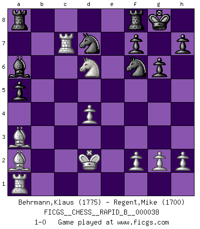 Last move : 1-0 2007 April 13 16:37:5 [Event "FICGS__CHESS__RAPID_B__000038"] [Site "FICGS"] [Date "2007.02.21"] [Round "1"] [White "Behrmann,Klaus"] [Black "Regent,Mike"] [Result "1-0"] [WhiteElo "1775"] [BlackElo "1700"] 1.d4 d5 2.c4 dxc4 3.Nf3 Nf6 4.e3 b5 5.a4 c6 6.axb5 cxb5 7.b3 e6 8.bxc4 Bb4+ 9.Nfd2 Bxd2+ 10.Nxd2 bxc4 11.Nxc4 O-O 12.Ba3 Re8 13.Nd6 Qa5+ 14.Qd2 Qxd2+ 15.Kxd2 Rd8 16.Bd3 a5 17.Rhc1 Ba6 18.Bc2 Nbd7 19.Bd1 e5 20.Bb3 Rf8 21.Rc7 exd4 22.exd4 g6 23.Ba2 1-0 QGA, 4.e3 Kingside Castling by player Black (move 11) Player White won this chess game. Follow this game move after move (download)Suddenly it was obvious to me in my analysis I had missed what Fischer had found with the greatest of ease at the board. (Mikhail Botvinnik) Ein Isolani verdüstert die Stimmung auf dem ganzen Schachbrett. (Savielly Grigorievitsch Tartakower) Cuando veas una buena jugada, trata de encontrar otra mejor. (Emanuel Lasker) Vous n'êtes pas toujours obligé de jouer le meilleur coup. Un coup doit être actif, entreprenant, correct et beau ! (David Bronstein) If you lose the game you should win the analysis! (Proverb)