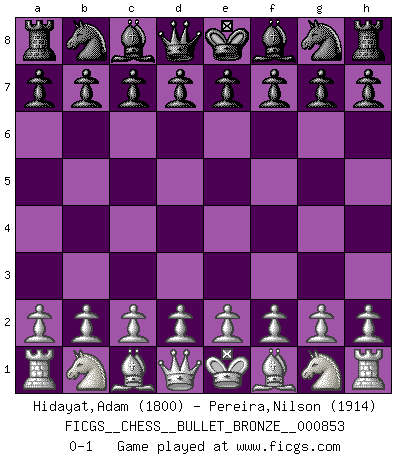 Last move : 0-1 2014 September 22 20:9:49 [Event "FICGS__CHESS__BULLET_BRONZE__000853"] [Site "FICGS"] [Date "2014.09.22"] [Round "1"] [White "Hidayat,Adam"] [Black "Pereira,Nilson"] [Result "0-1"] [WhiteElo "1800"] [BlackElo "1914"] 0-1 This chess game has been lost on time (started : 2014.09.22 17:22:27) Player Black won this chess game. Follow this game move after move (download)Excellence at Chess is one mark of a scheming mind. (Sir Arthur Conan Doyle) Bis jetzt ist Weiß einer wohlbekannten Analyse gefolgt. Aber jetzt begeht er einen schrecklichen Fehler: Er beginnt seinen eigenen Kopf zu benutzen. (Siegbert Tarrasch) Tu eres para mi la Reina en d8 y yo soy el Peón en d7!!. (GM Eduard Gufeld) Les échecs sont utiles à l'exercice de la faculté de penser et à celle de l'imagination. Car nous devons posséder une méthode élaborée pour atteindre des buts partout où nous devons conduire notre raison. (Leibnitz) Gambling : The sure way of getting nothing from something. (Wilson Mizner)