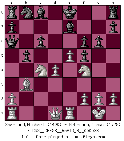 Last move : 1-0 2007 February 27 8:5:2 [Event "FICGS__CHESS__RAPID_B__000038"] [Site "FICGS"] [Date "2007.02.21"] [Round "1"] [White "Sharland,Michael"] [Black "Behrmann,Klaus"] [Result "1-0"] [WhiteElo "1400"] [BlackElo "1775"] 1.d4 f5 2.Bg5 Nf6 3.Bxf6 exf6 4.e3 d5 5.c4 dxc4 6.Bxc4 Qe7 7.Ne2 Qb4+ 8.Nd2 Qxb2 9.O-O c6 10.Nf4 g6 11.Re1 Be7 12.Bb3 Qa3 13.Nc4 Qa6 14.e4 b5 15.e5 1-0 Dutch, 2.Bg5 variation Kingside Castling by player White (move 9) Player White won this chess game. Follow this game move after move (download)We must make sure that Chess will not be like a dead language, very interesting, but for a very small group. (Sytze Faber) Sie bekommen vielleicht den Eindruck, dass die Spitzenspieler überhaupt gar nicht so stark sind. Aber das stimmt nicht. Es ist eine Illusion. Mit einem Computer an der Seite ist es sehr leicht, Urteile zu fällen, aber wenn man alleine am Brett sitzt, sieht die Sache ganz anders aus. (Vladimir Kramnik) Puntos débiles o agujeros en la posición de tu oponente deben de ser ocupados por piezas, no Peones. (Siegbert Tarrasch) La conception d'un plan est le processus par lequel un joueur exploite les avantages de sa position tout en s'efforçant d'en réduire au minimum les inconvénients. Afin de garantir le succès, un plan doit toujours se fonder sur un diagnostic objectif des particularités d'une position. La conception d'un plan est d'autant plus difficile que la position est équilibrée, et grandement facilitée lorsqu'il n'existe qu'un seul plan susceptible de répondre aux exigences de la position. (Harry Golombek) Hello Thibault, if I have had a plan (and I had one, I hope), I have forgotten it during the last week... - Hello Heinz-Georg. What do you mean a plan ? (Anonymous players, during a Big Chess game)